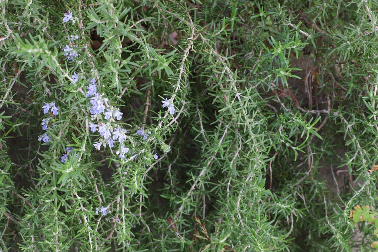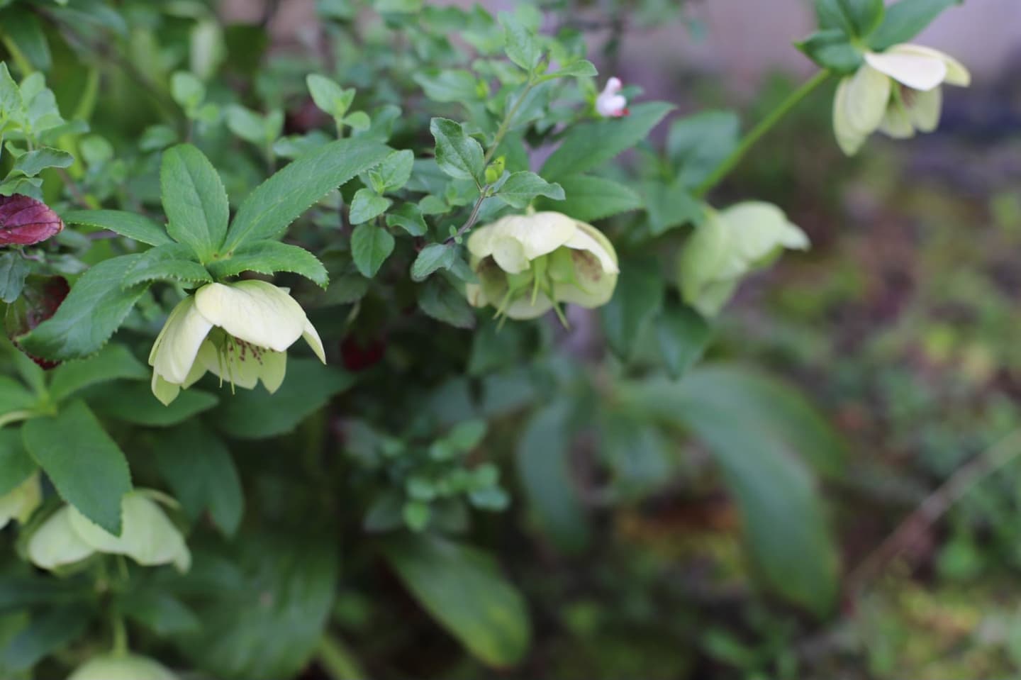 ミモザやユーカリ、ハーブ類、草花が包む外観。