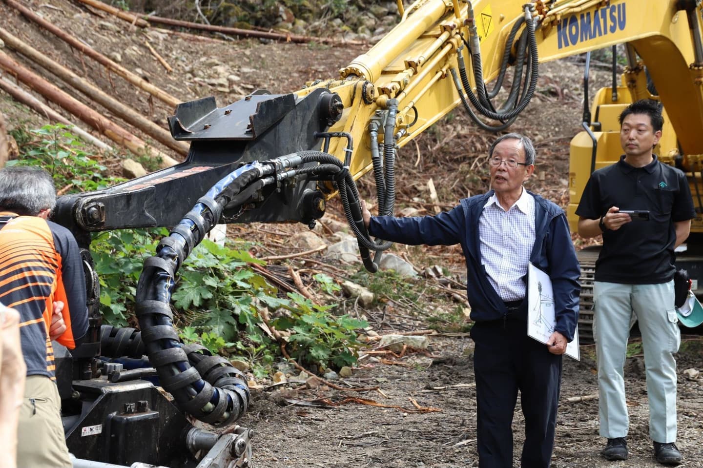 写真下左:山の案内人を務める、山長林業の田上(たのうえ)さん。わかりやすい図を用いながら、樹を伐採して集積し、山から運ぶ方法についてお話しいただいた。昔は全て手作業だったが、今は最新の重機や道具を使いながら効率的に進めている。重機の操縦席は空調付きで作業がしやすく、若手社員にも好評だという。