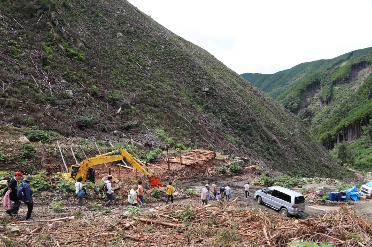 伐採には、間引きをする「間伐」と、一帯の樹をすべて伐る「主伐」があり、今回の見学地は主伐を行っている場所。地崩れを起こさないためにも計画的に行われており、山全体の中で部分的に展開。谷に沿って道が整備されており、重機や車が近くまで入ることができる。
