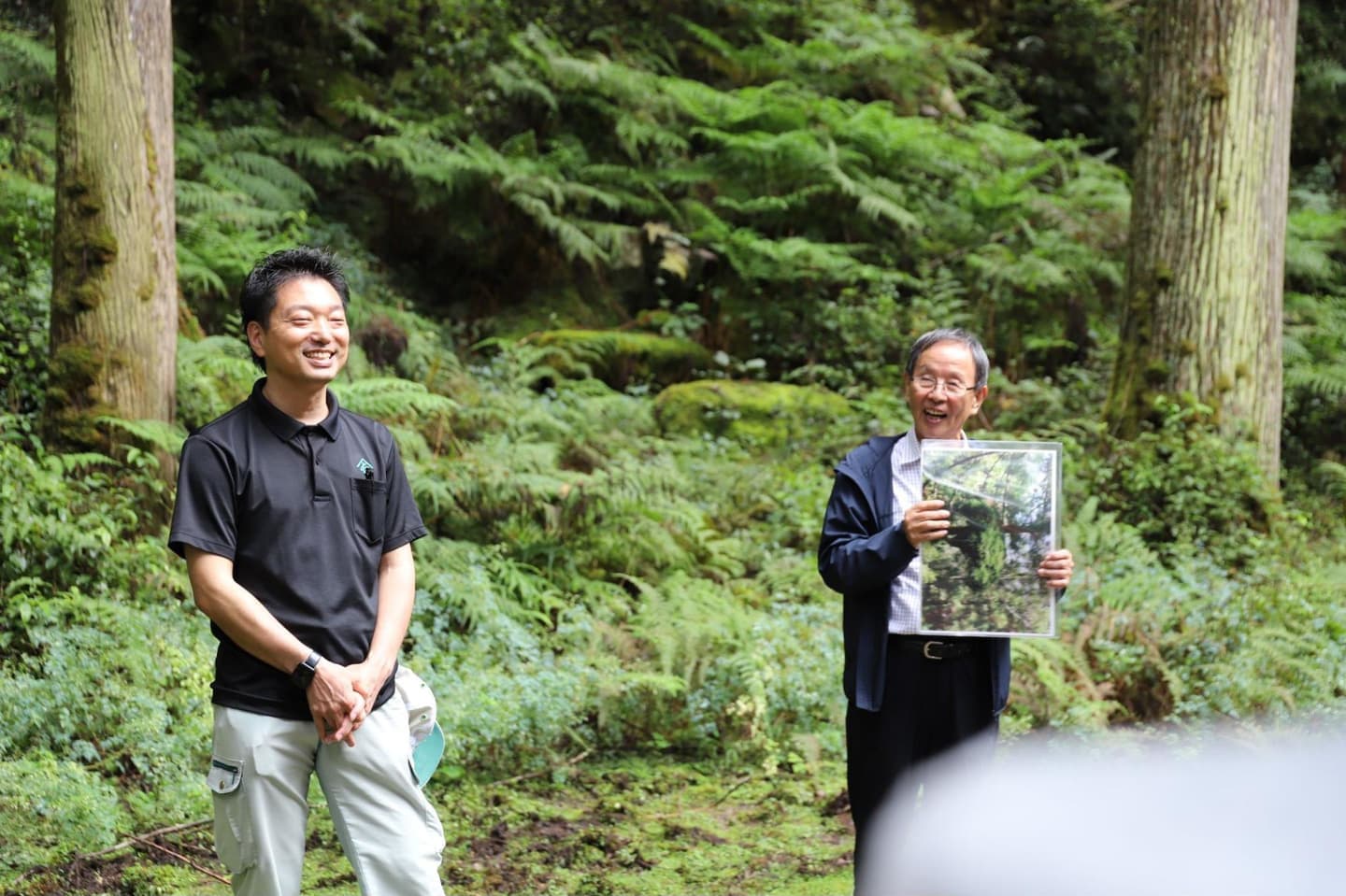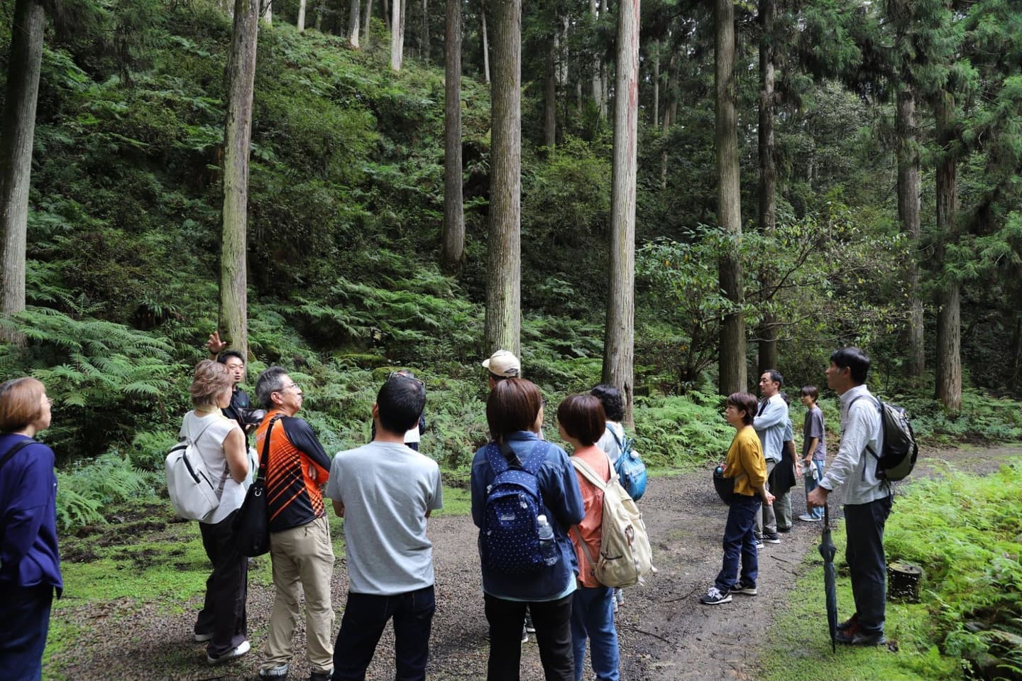 一帯は明治26年に20haに10万本の樹を植林した記録が残っており、130年を超える木々たちが迎える様は圧巻。ところどころ近年植林された場所があり、足元には下草が茂り、健全な循環と手入れを感じられる、豊かな森です。