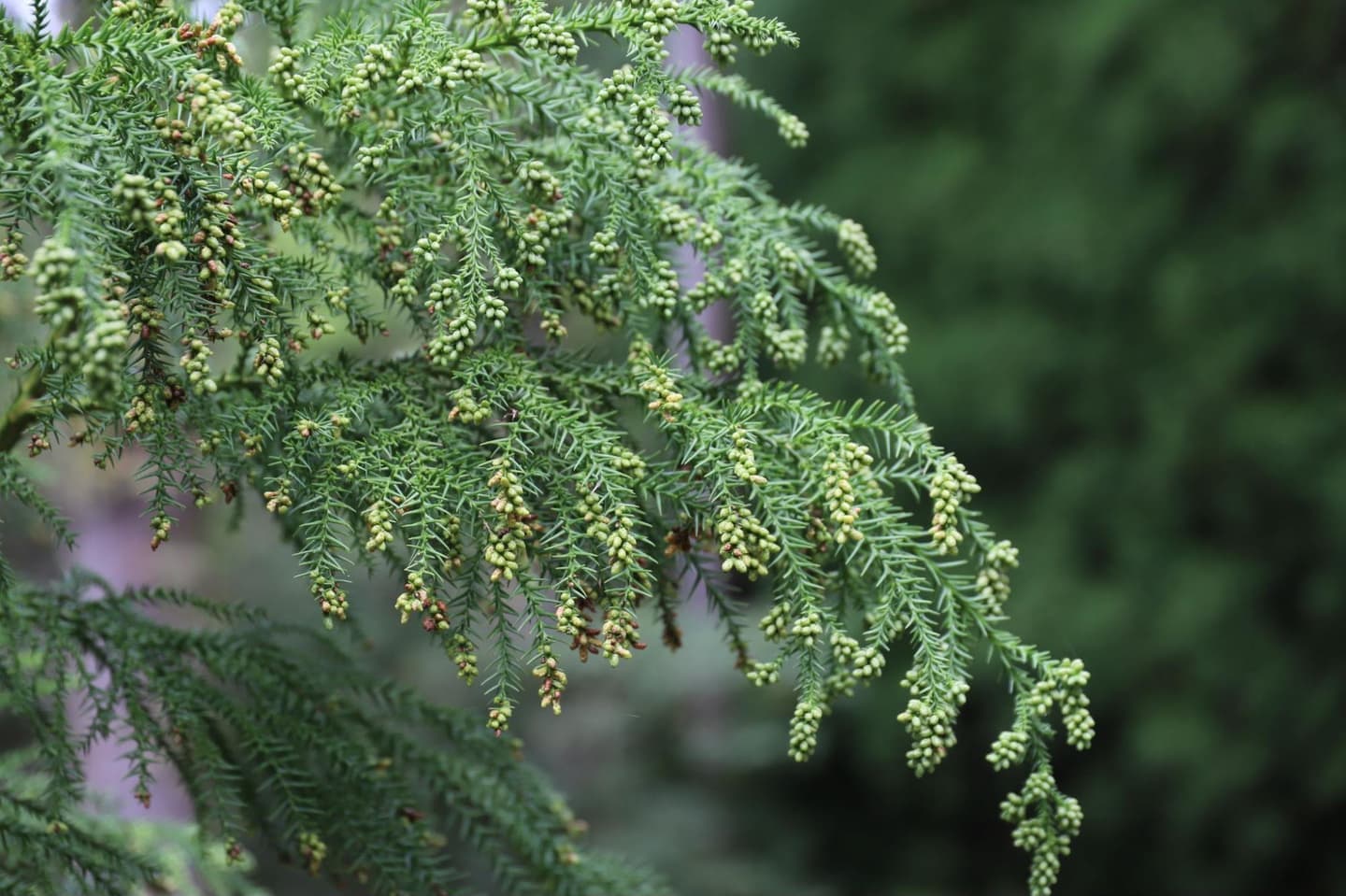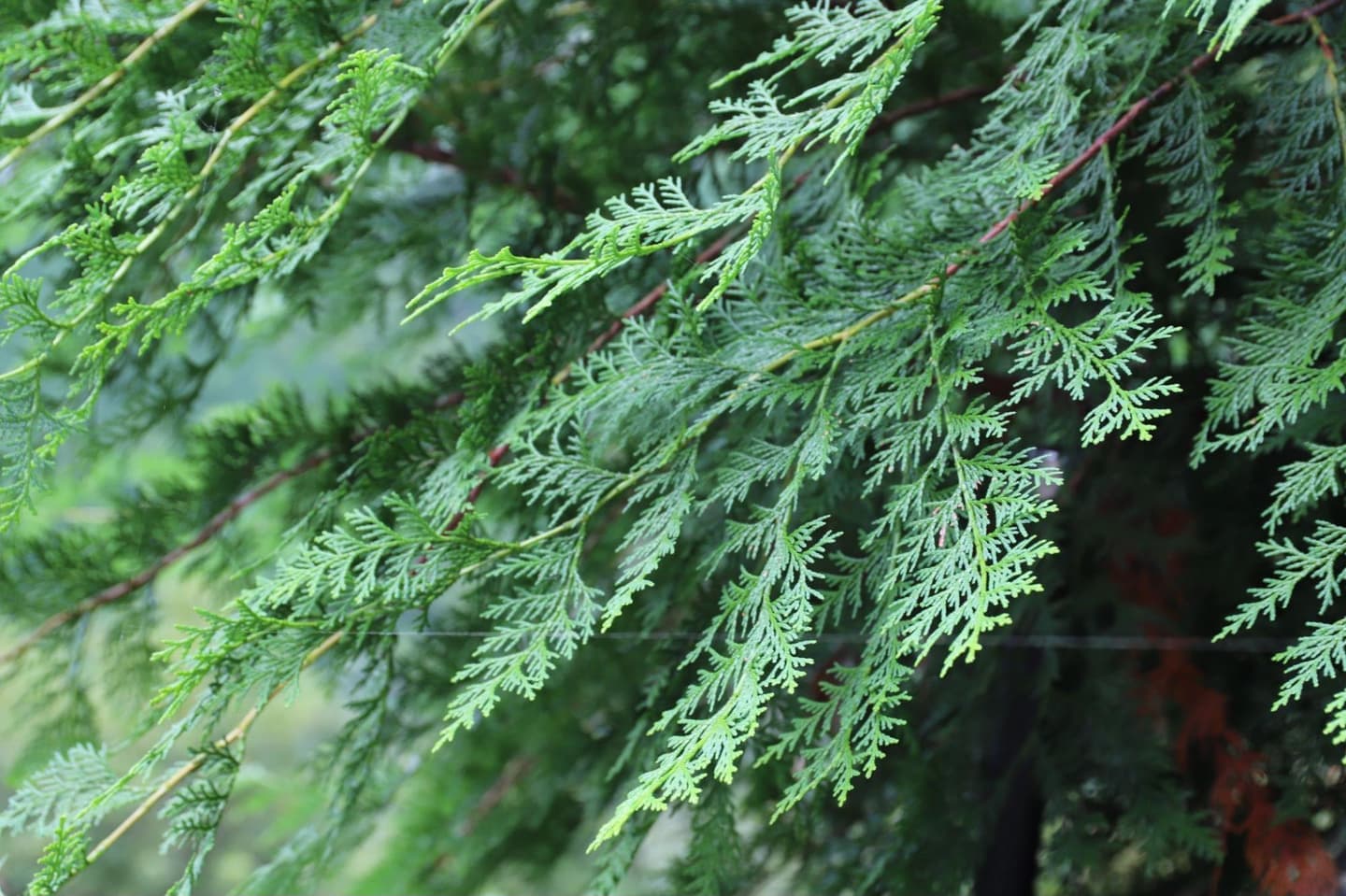 杉と桧の見分け方を教えてくださる田上さん。写真左が杉で、右が桧。杉は立体感のある葉で、樹皮はピタッとくっついており簡単には剥けない。一方、桧は平面的な葉の形をしており、樹皮は浮き気味で、ペロリと比較的簡単に剥ける。