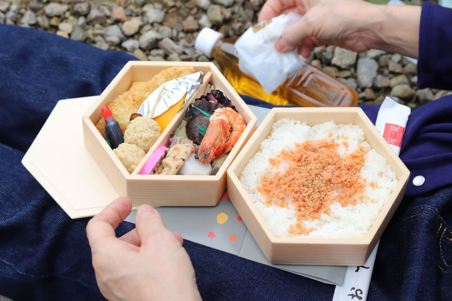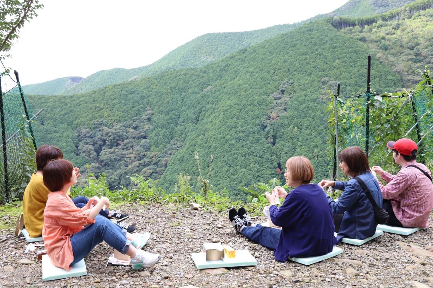山長の山々を見渡す高台でお弁当タイム。教えていただいたことを反芻しながら、参加者同士でのおしゃべりも楽しい時間に。山全体を見渡すと、部分的に樹種が異なることがわかる。「落ち着いた緑色でブロッコリーのようにモコモコしているところは広葉樹林です。植林をしないと、シイやカシの木が優先して育ちます。崖地で植林できないので、広葉樹が生えています」と教えていただいた。