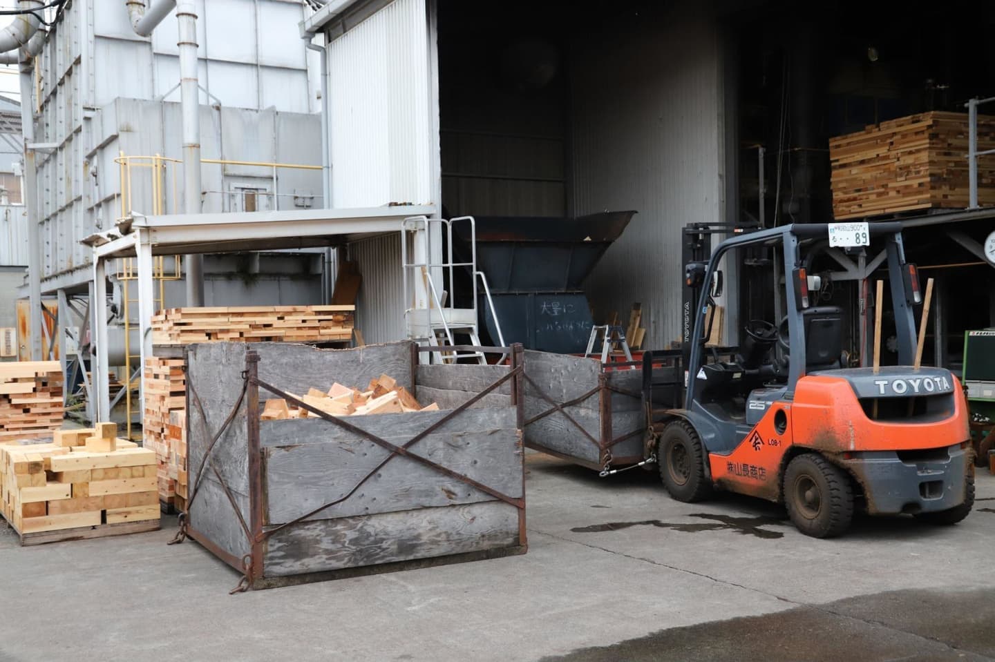 含水率の高い杉は3週間ほど、含水率の低い桧は1週間ほど乾燥。天然乾燥に近い色合いで、乾燥しにくい材内部の赤身部分もしっかりと乾燥できるのですが、この乾燥機はとても高額なのだそう。ランニングコストも一般的な乾燥機よりも必要なため、製材途中で出たおが屑や売り物にならない木材を燃やした蒸気を原動力にして、70%エネルギーをカットしているのだと言います。
