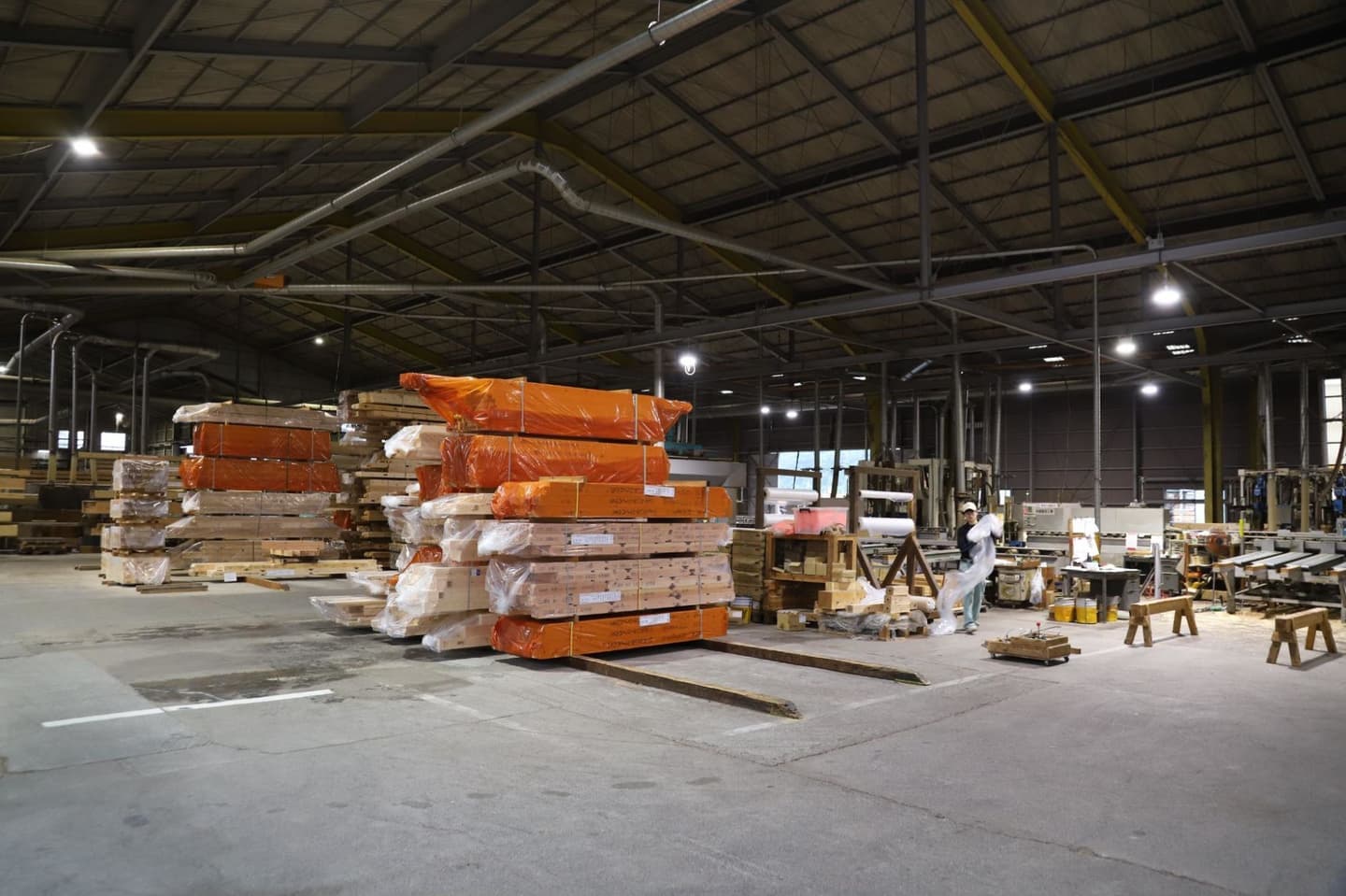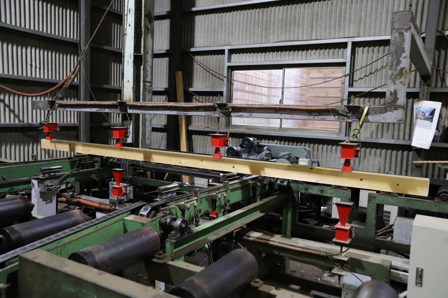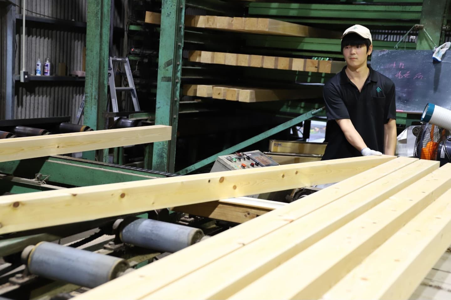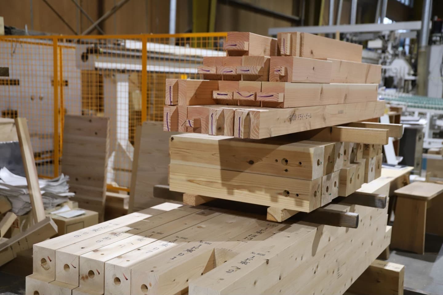 プレカット加工場の様子。加工に入る前にさらに人の目による検品を行う。節が抜ける可能性のあるものや、カミキリ虫などの虫食いがある木材はこの時点で避けられる。