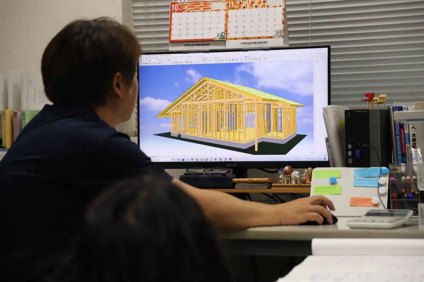 CAD室でプレカット加工前に木材を配置するオペレーションの様子を拝見。
