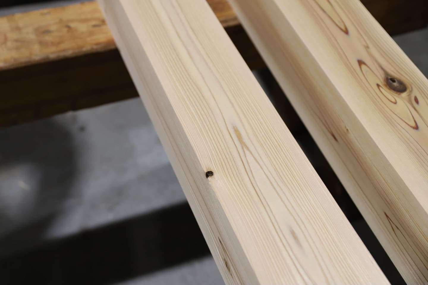 成長過程で枝を払い、下草を刈り、曲がった木を除伐し、間伐を行って十分な空間をつくり、構造材に適した木材に育つよう管理されてきたため、枝は上部にのみ残り、まっすぐに育っている。
