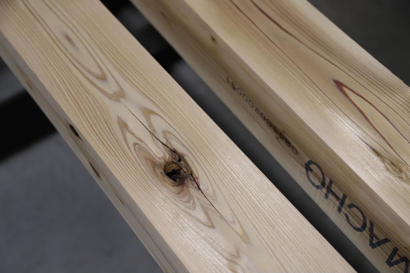 乾燥を終えた構造材に割れや微妙な曲がりがないか、不具合はないかを、1本1本、人の目で検品し、モルダーと呼ばれるやすりがけをして表面を整えます。その後、木材中の水分量を測定する含水率測定器、木材の曲げ強度を測定するヤング係数測定器に通され、規定をクリアした材がJAS製品として用意されます。