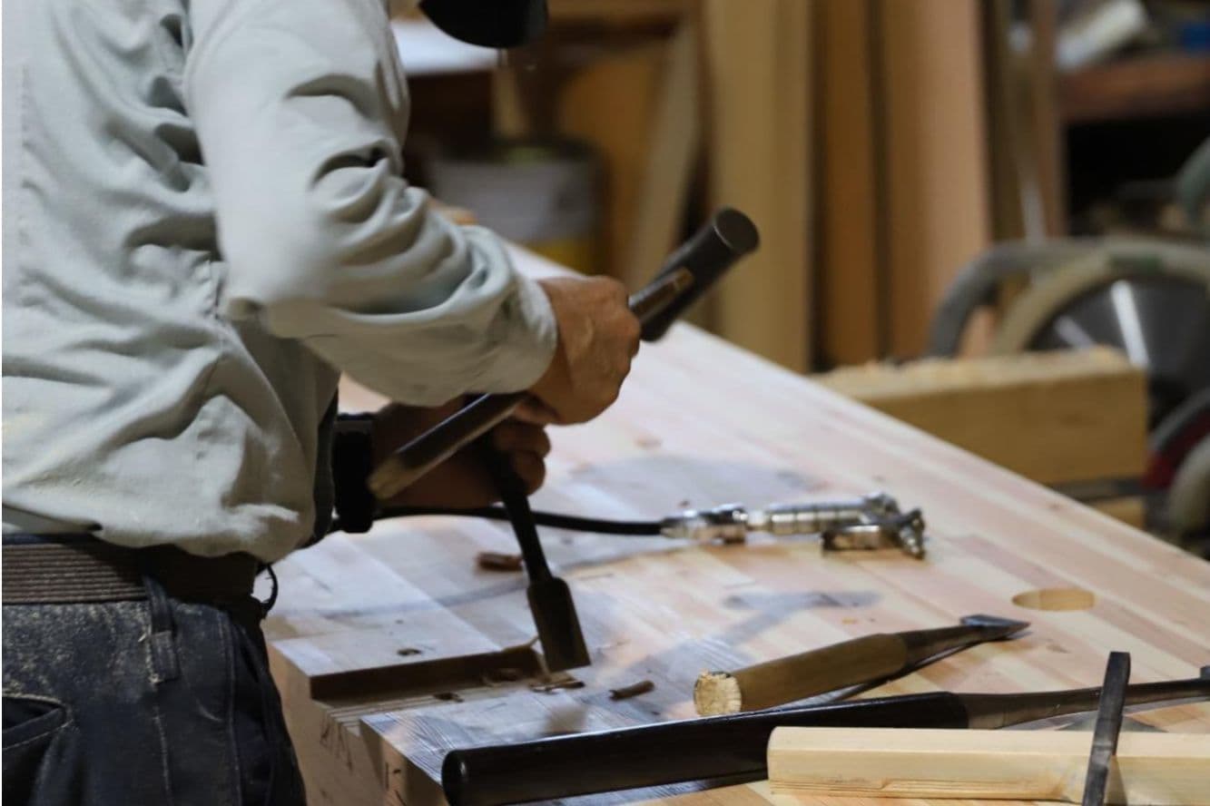 プレカット加工は基本的に機械で行うが、場合によっては手彫りすることもある(写真右上)