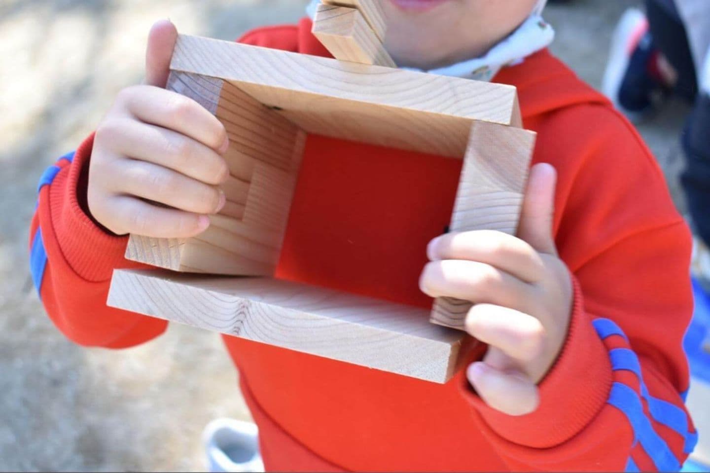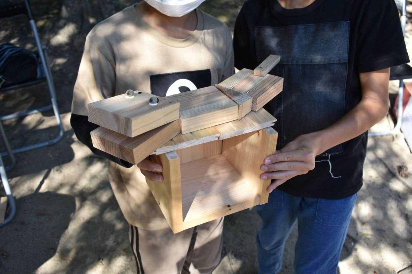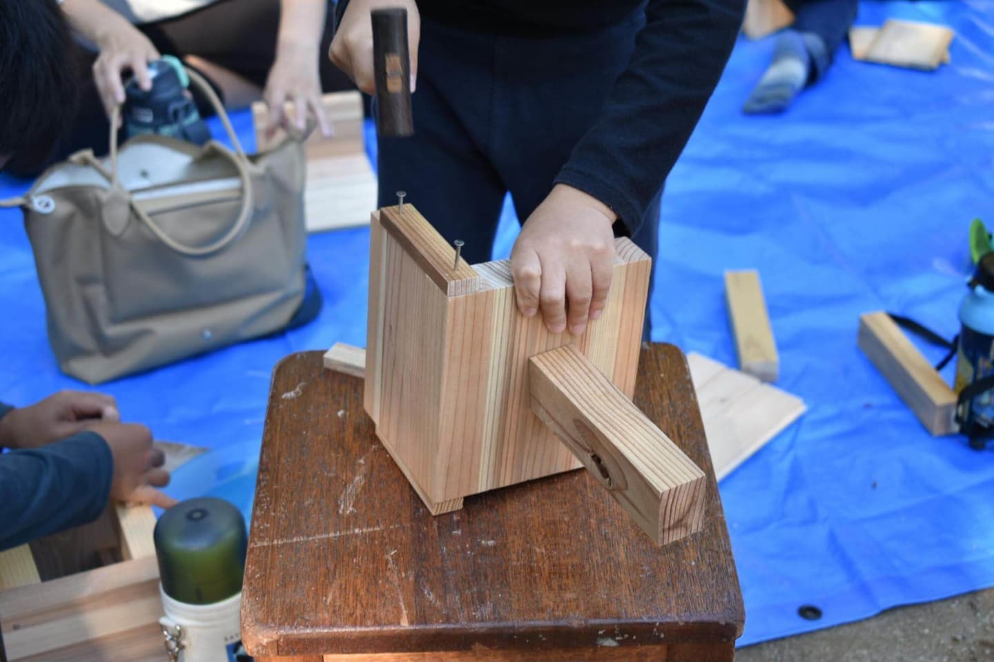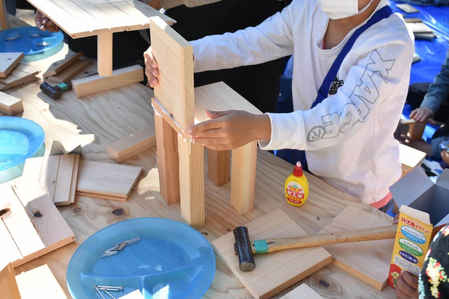 本格的な椅子や棚をつくる子もいれば、自由に木材を繋げていく子もいる。自らの手で作り出したことに満足げで、生き生きとした表情が印象的。親御さんの方が一生懸命になっている一幕も。
