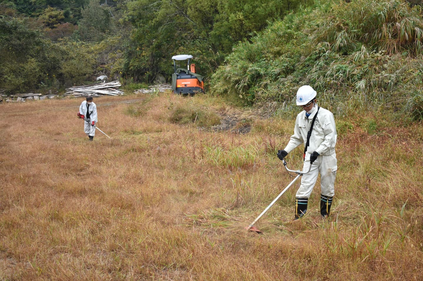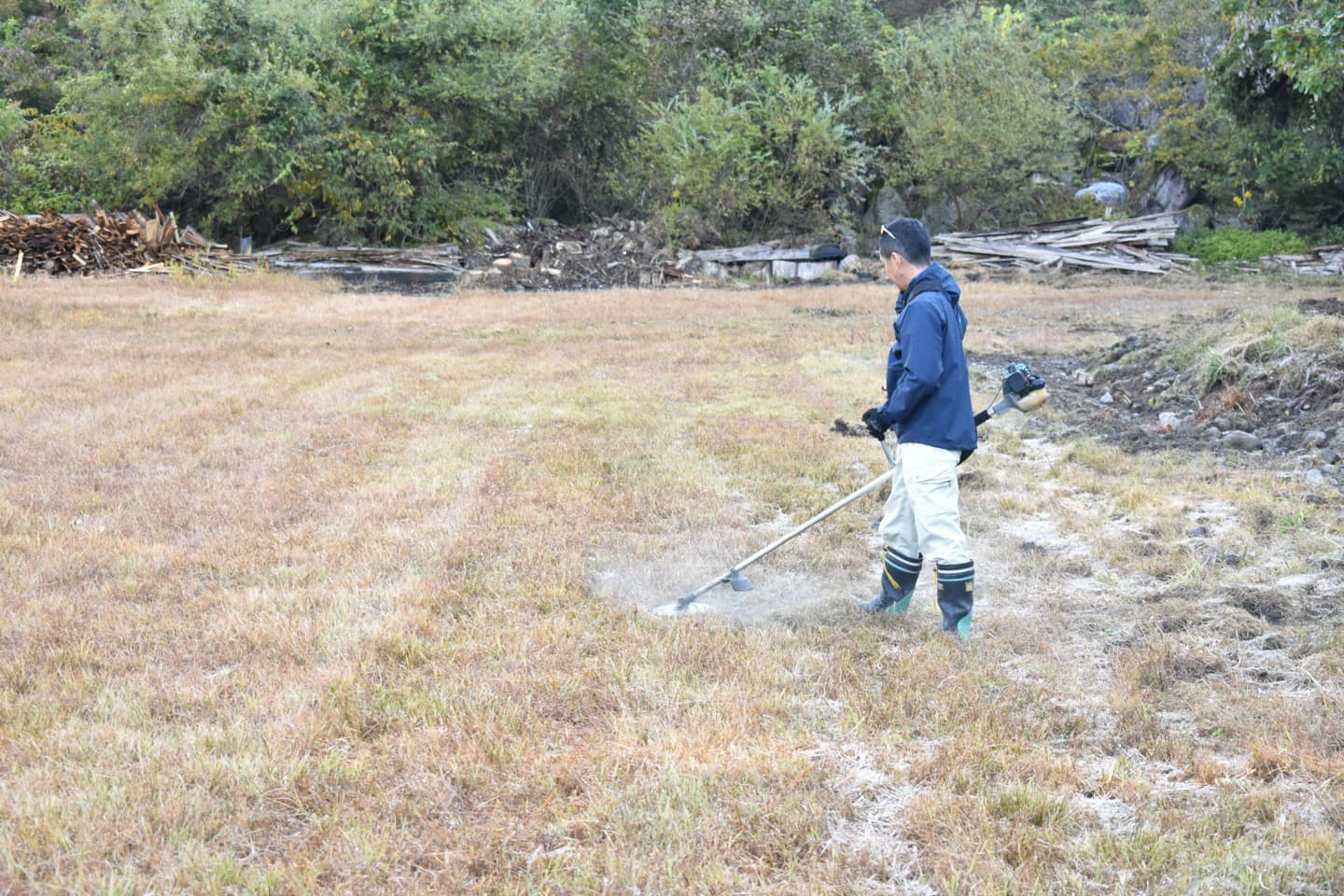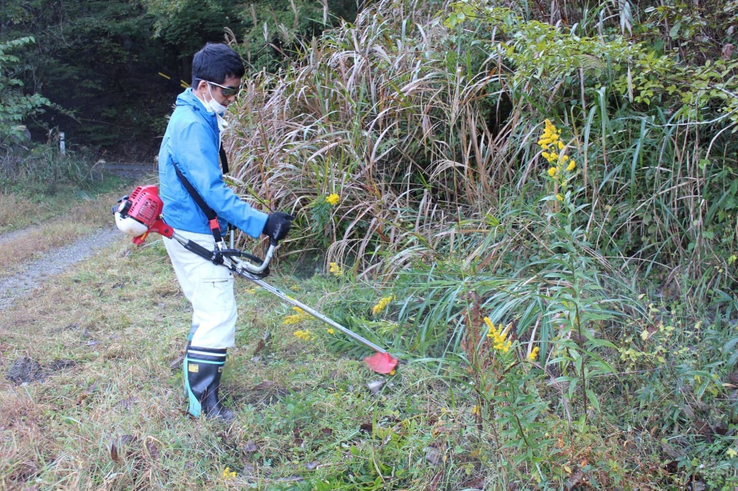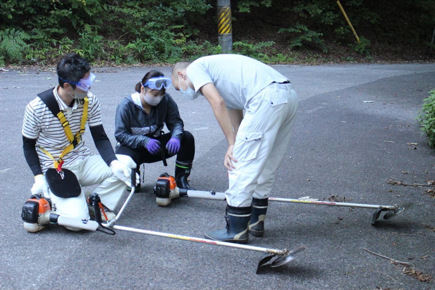 草刈り機がはじめてのスタッフも、レクチャーを受けて草刈りに挑戦!