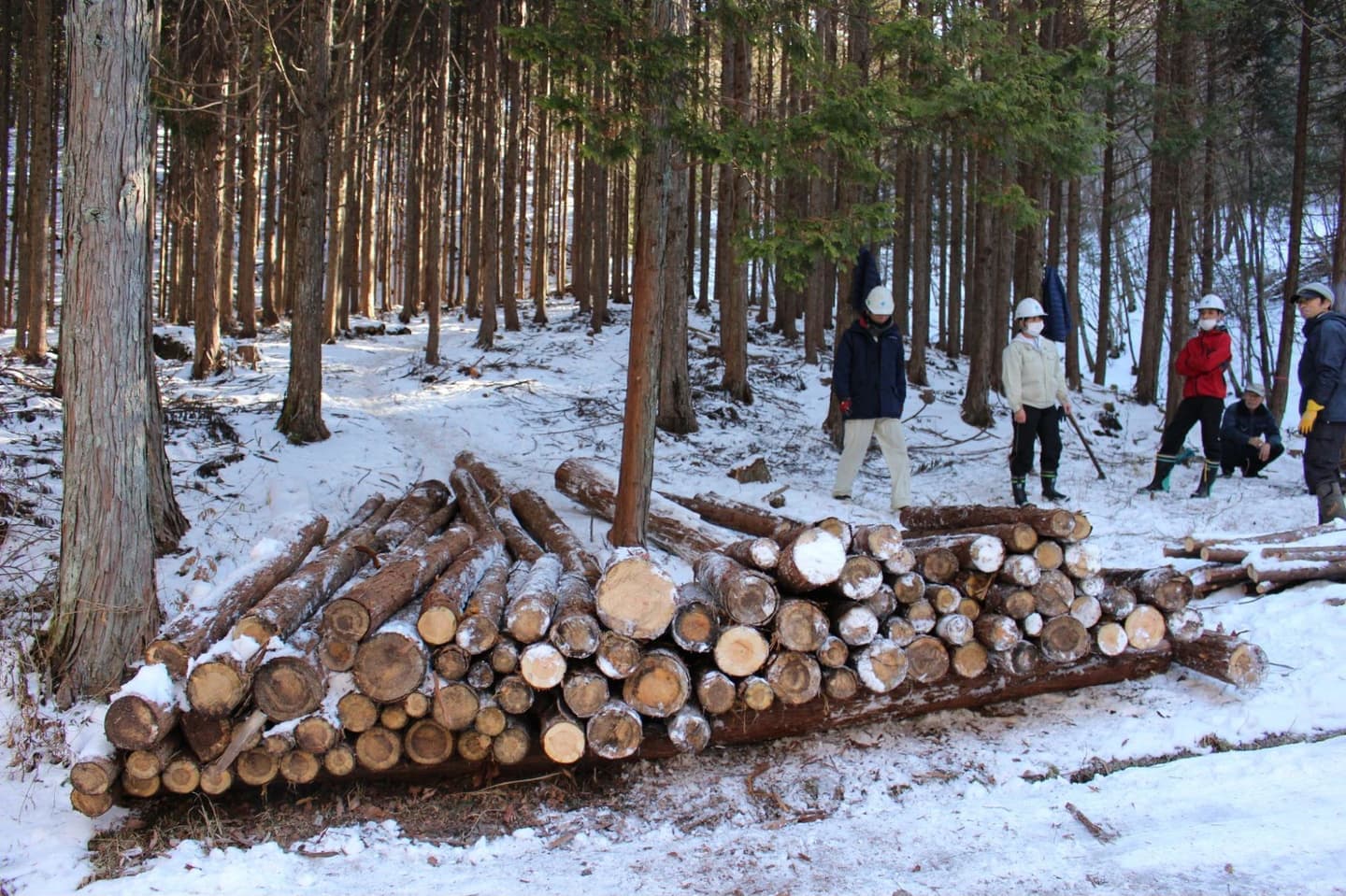 豊田市小田木町内の人工林にて、間伐材の搬出、運搬作業を実施。
