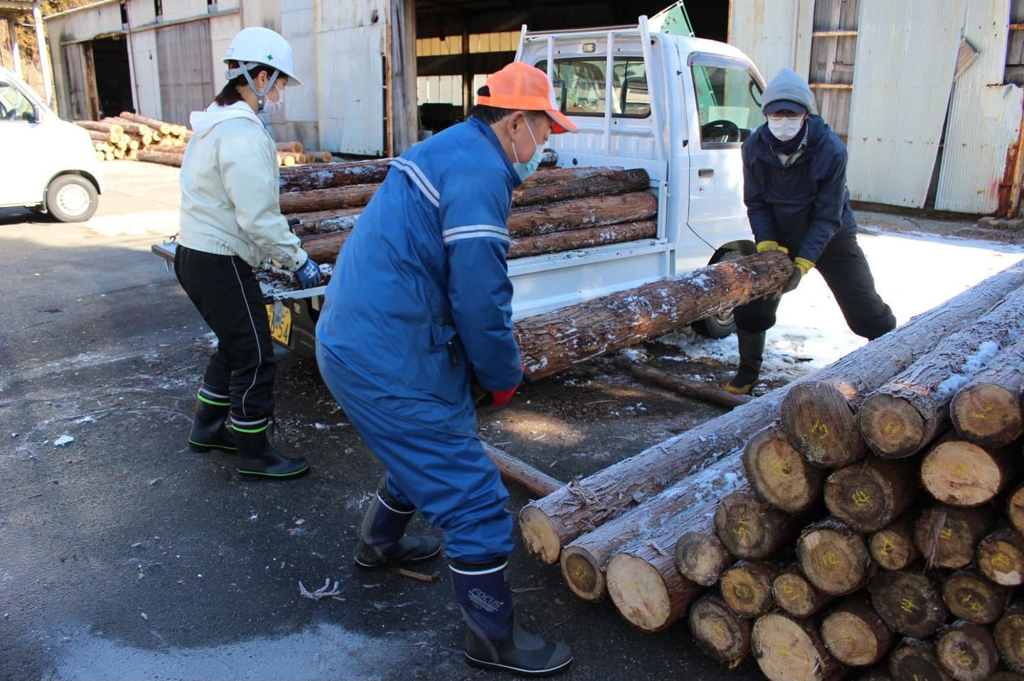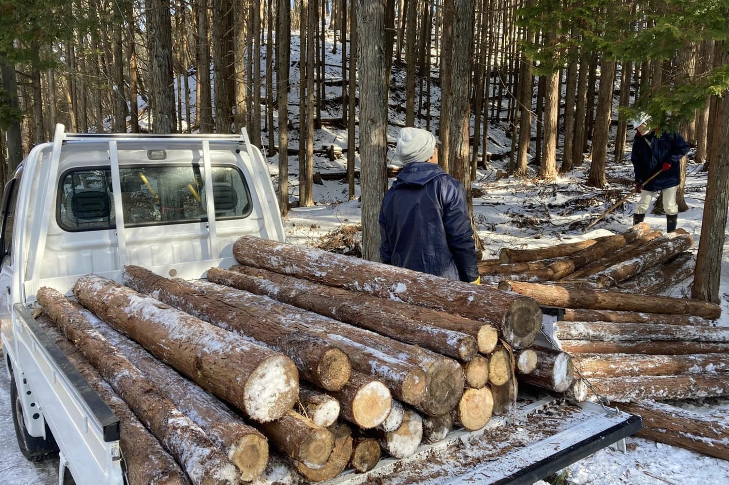 一か所に集められた間伐材を、軽トラックに積み、貯木場へ運搬。