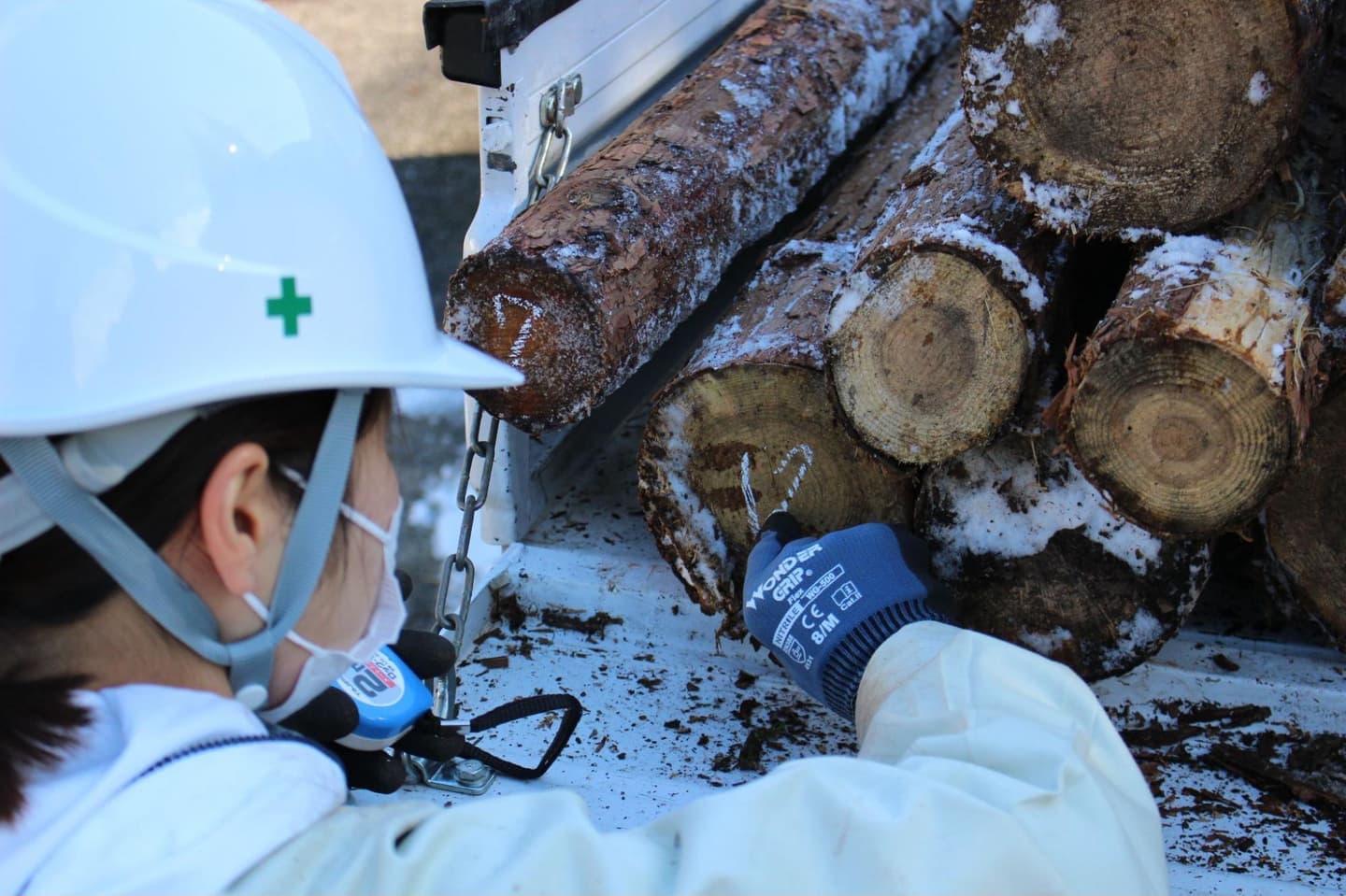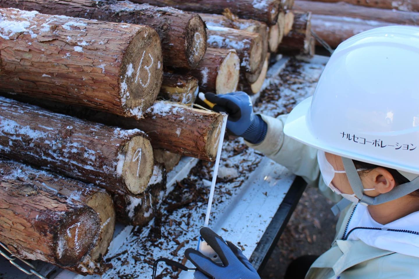 貯木場では、間伐材の径を測りチョークで記載していく。普段ナルセノイエで使う木々も山は違えど、このようにして運び出され、卸されていることを体験をもって知る。