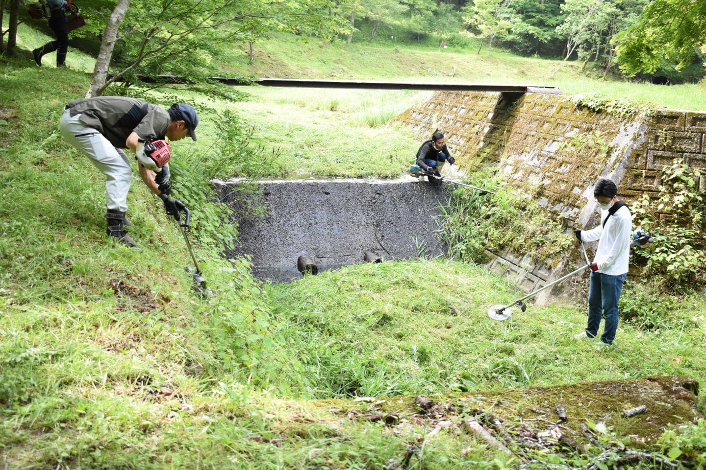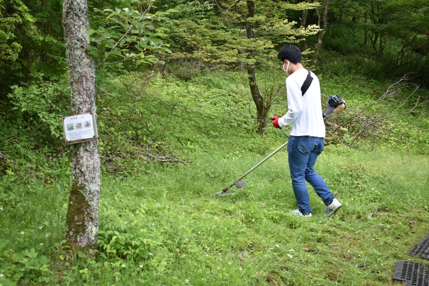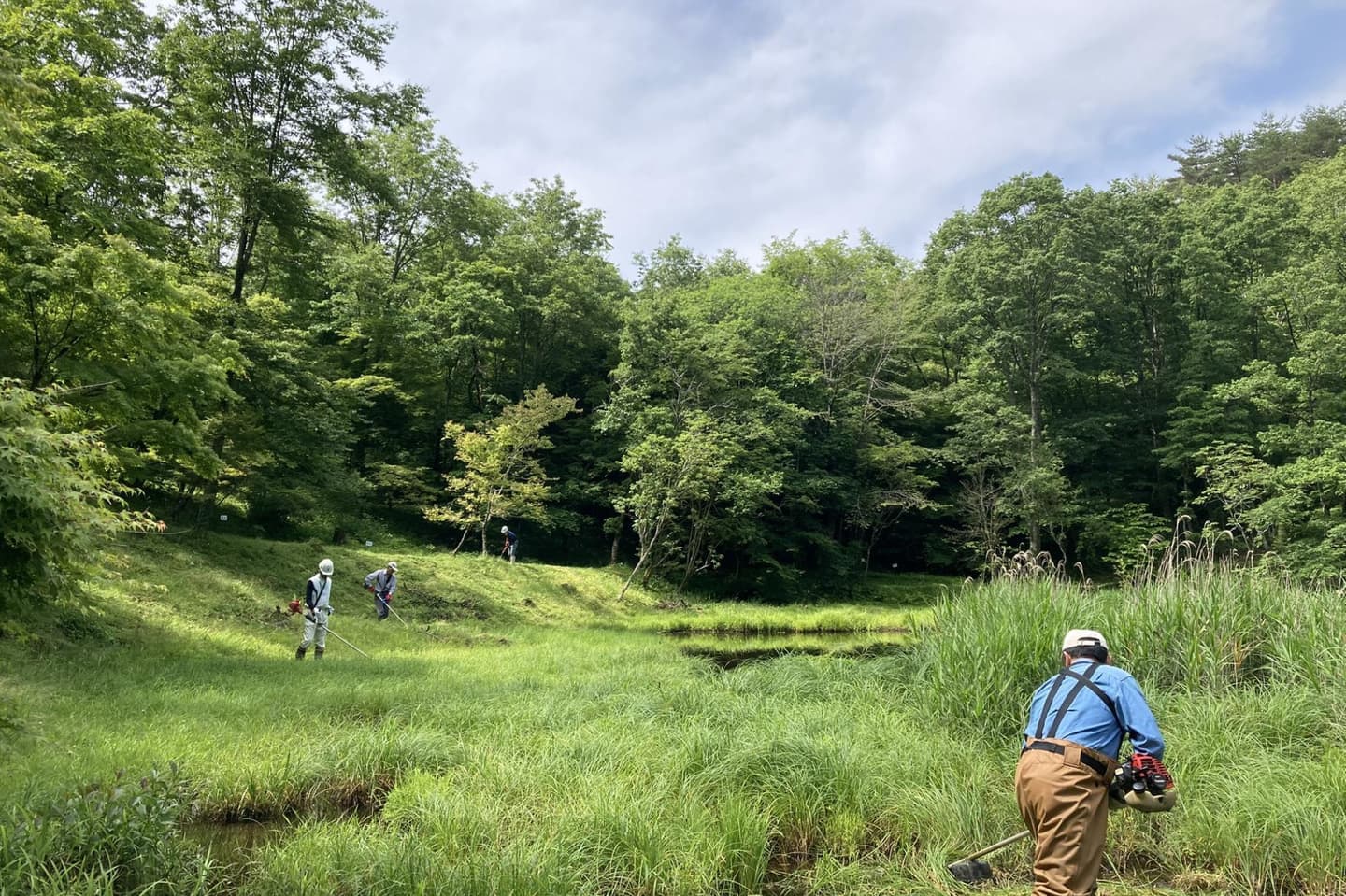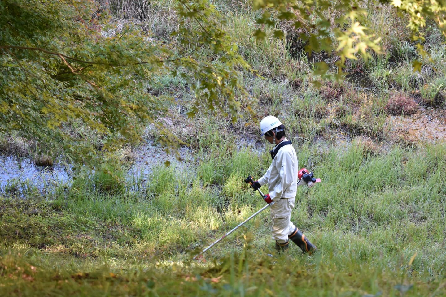 保全活動をされる現地の方々と協働して、散策路を中心に生態系に配慮しながら草を刈りこんでいきます。