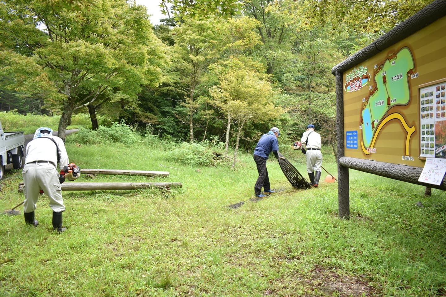 タカドヤ湿地に最も人が訪れる紅葉シーズンを前に、散策路や駐車場の草刈り・整備のお手伝い。