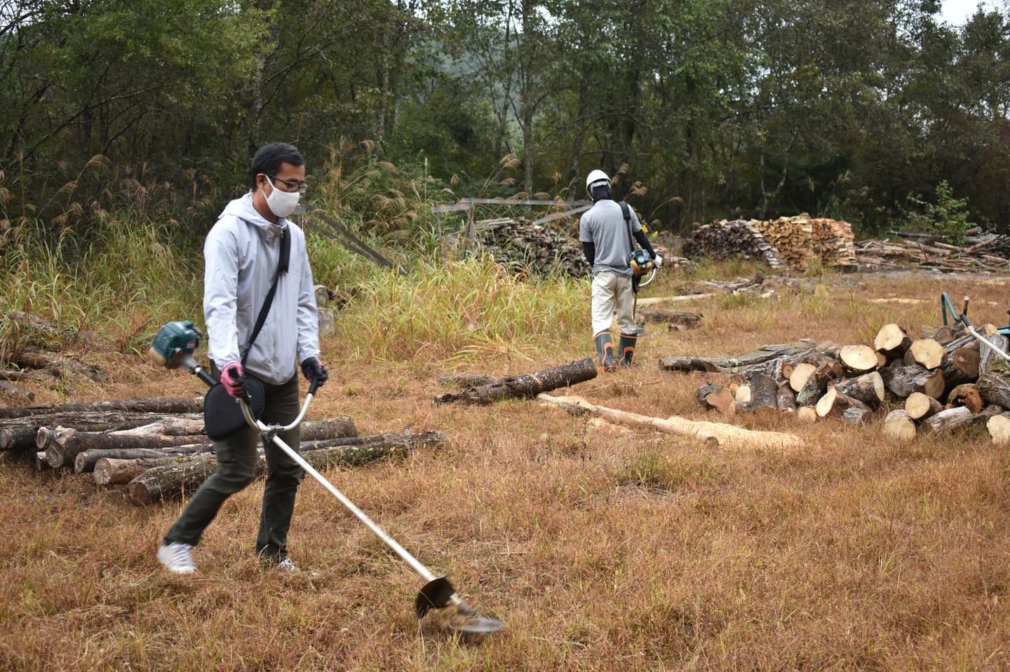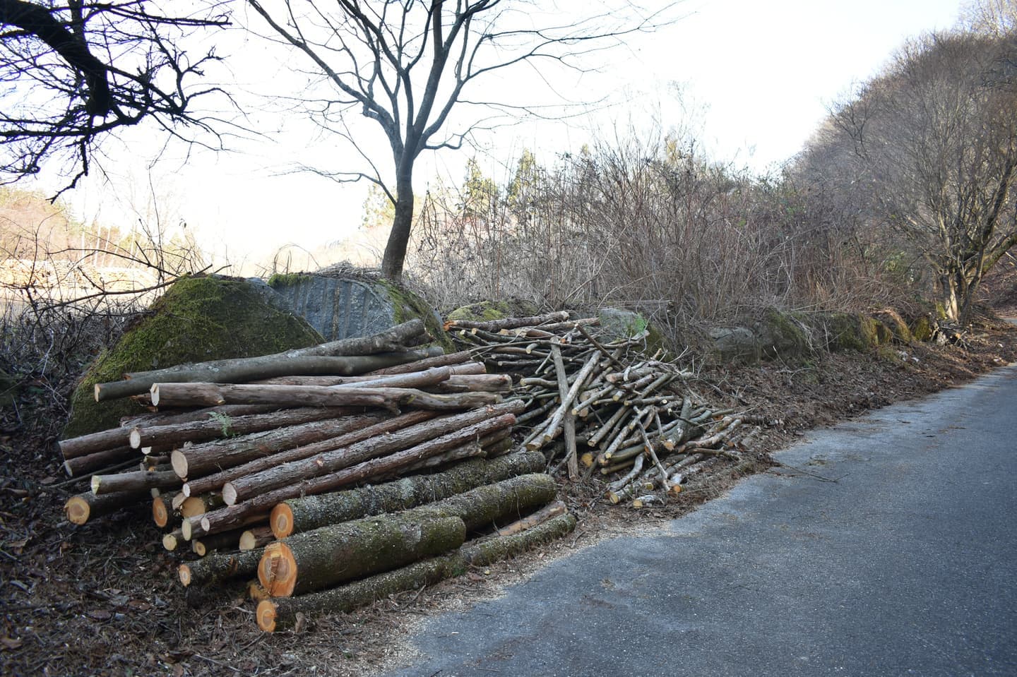 長さ2mほどにカットされた間伐材を一か所に集めて山を作る。
