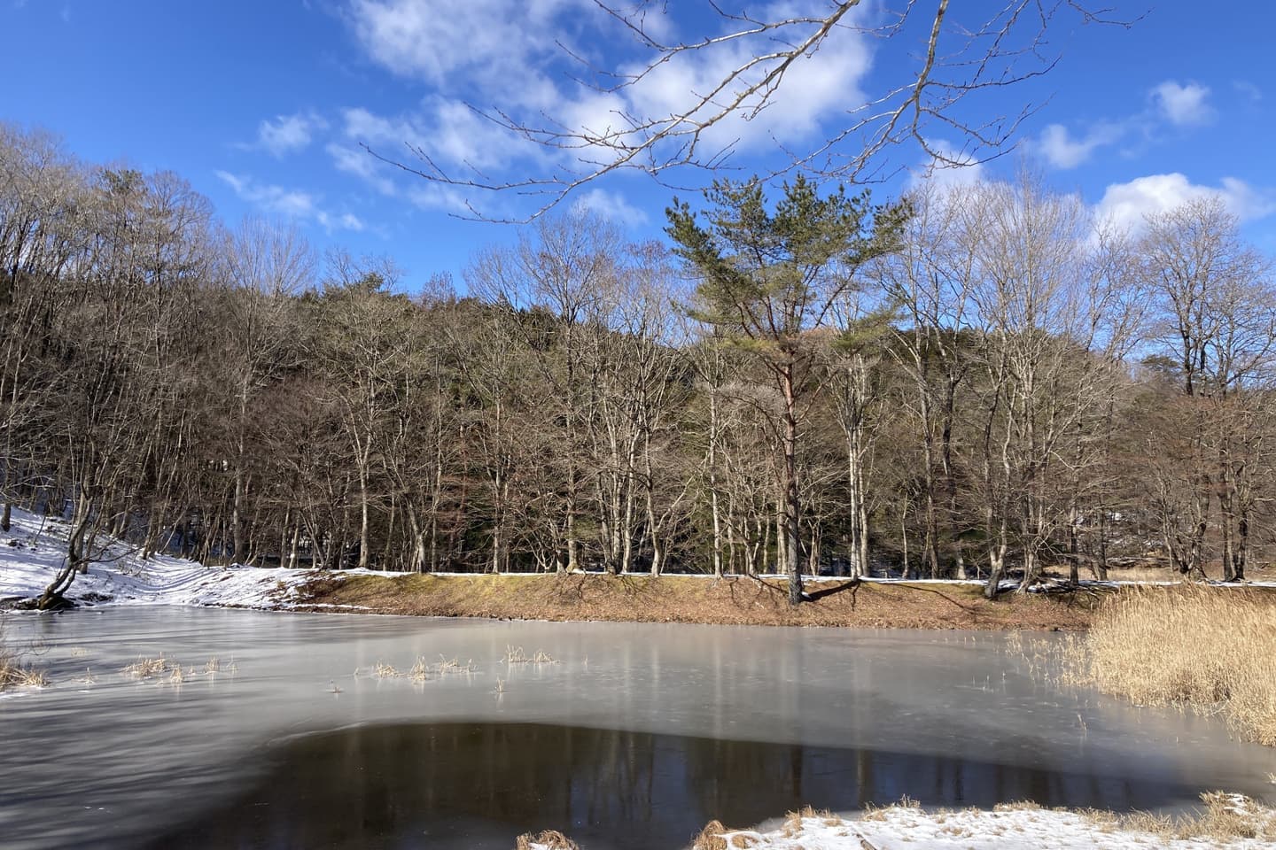 年が明けた春―タカドヤ湿地の下見を行う。写真の木々は紅葉で、紅葉シーズンには多くの観光客で賑わう場所だ。
