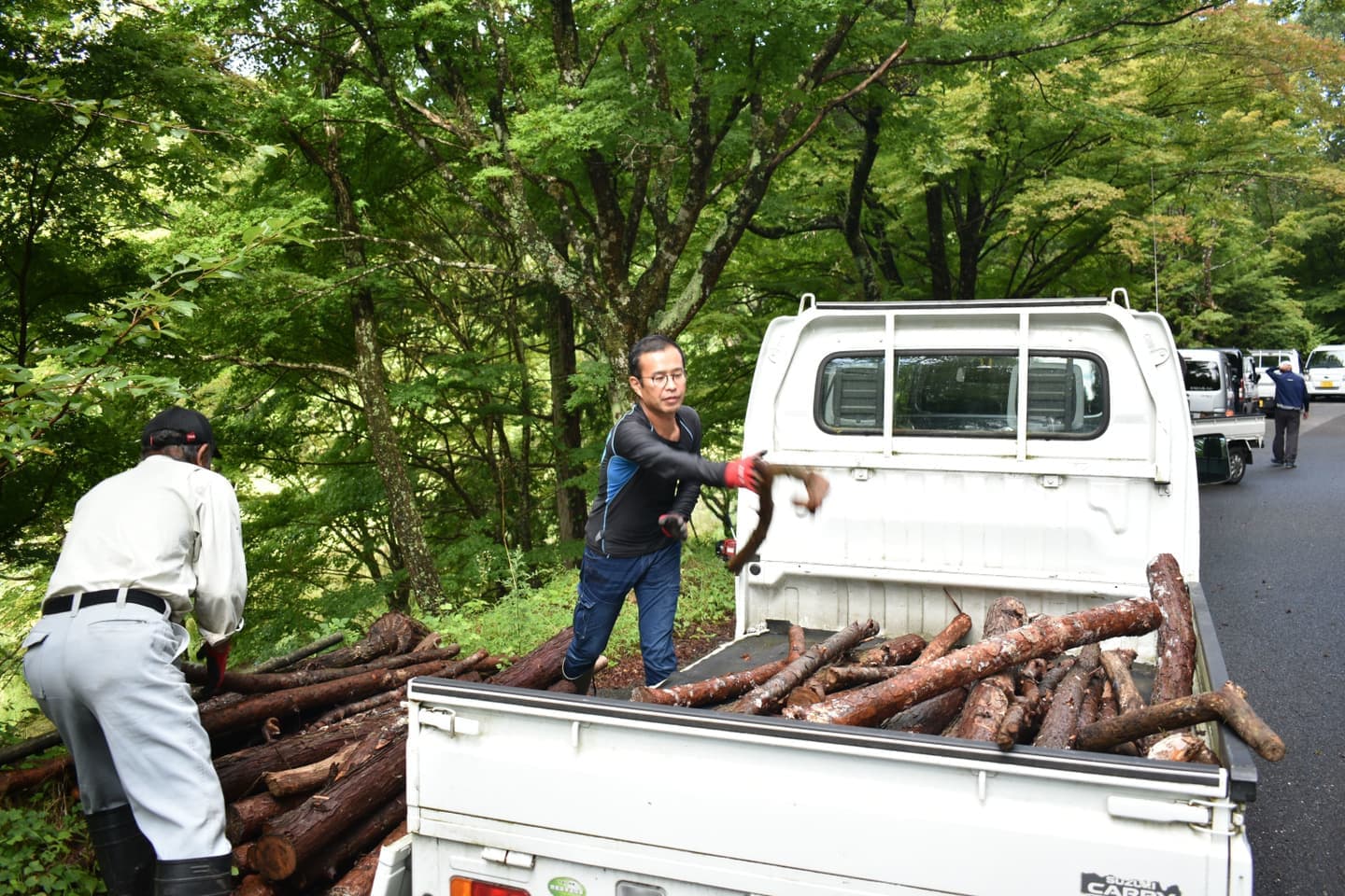 私たちができることは、間伐された木々を山から搬出し、木の駅プロジェクトの貯木場に運ぶ手助けをすることだと考え、ユニック車や軽トラックなどの機材と、スタッフの労働力をもって参加しています。