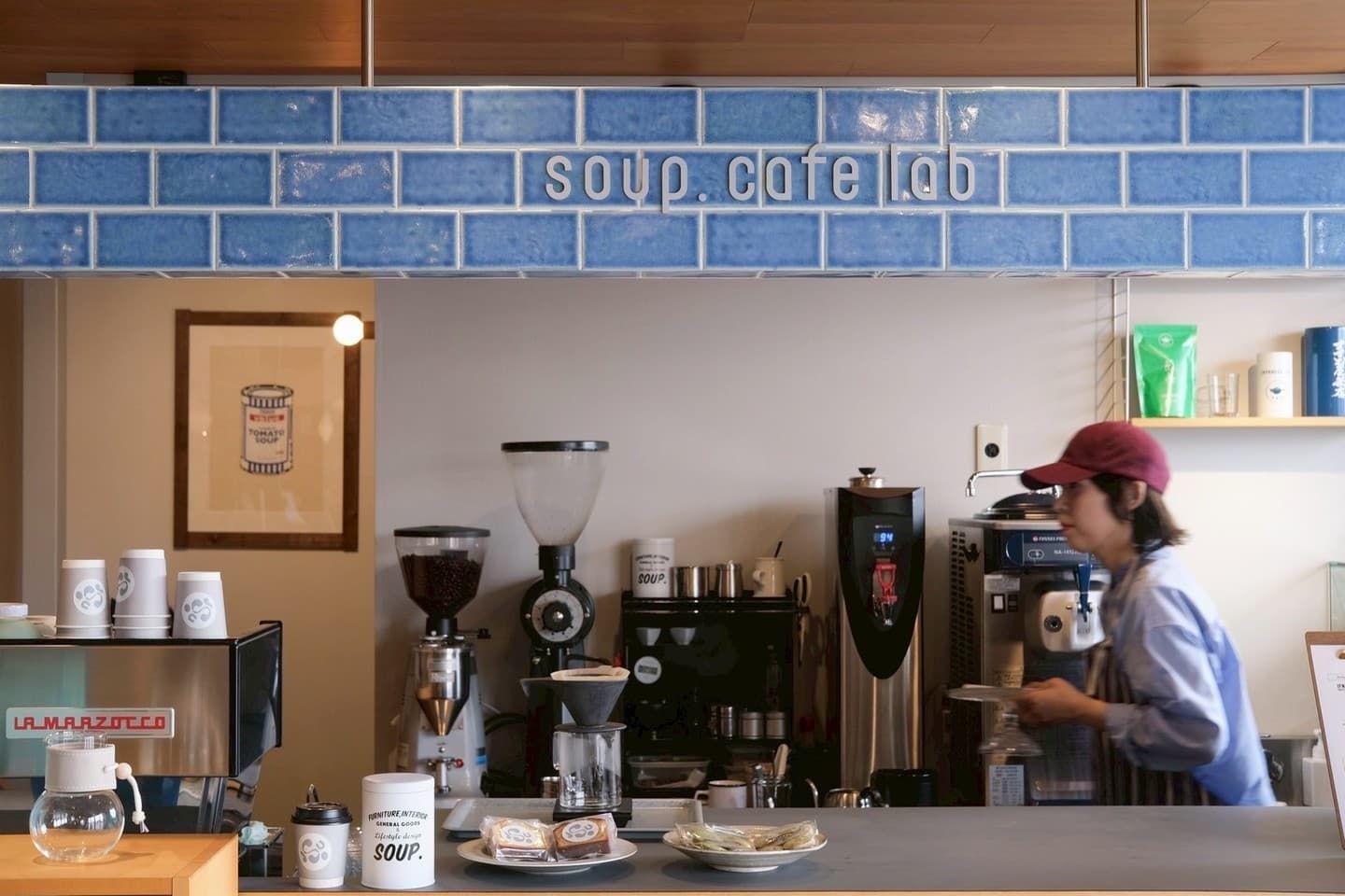 soup.cafe labでは、こだわりの豆を使用したドリップコーヒーに各種ラテに日本茶、ソフトクリーム、焼き菓子など、幅広いメニューを用意。季節や企画展に合わせての新メニューやpopup、workshopなど積極的に企画。皆さんと一緒につくる”実験室のような場”を目指している。