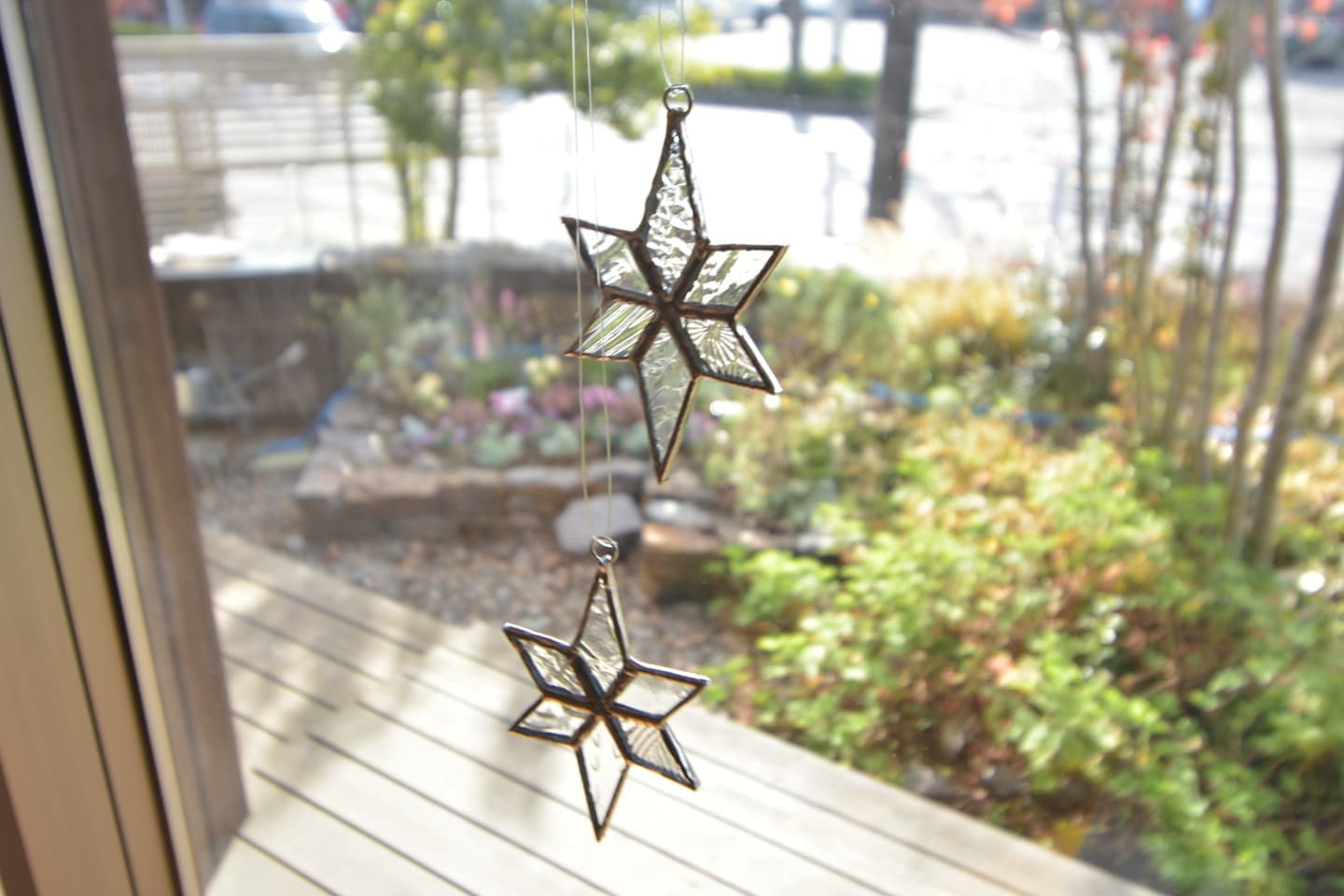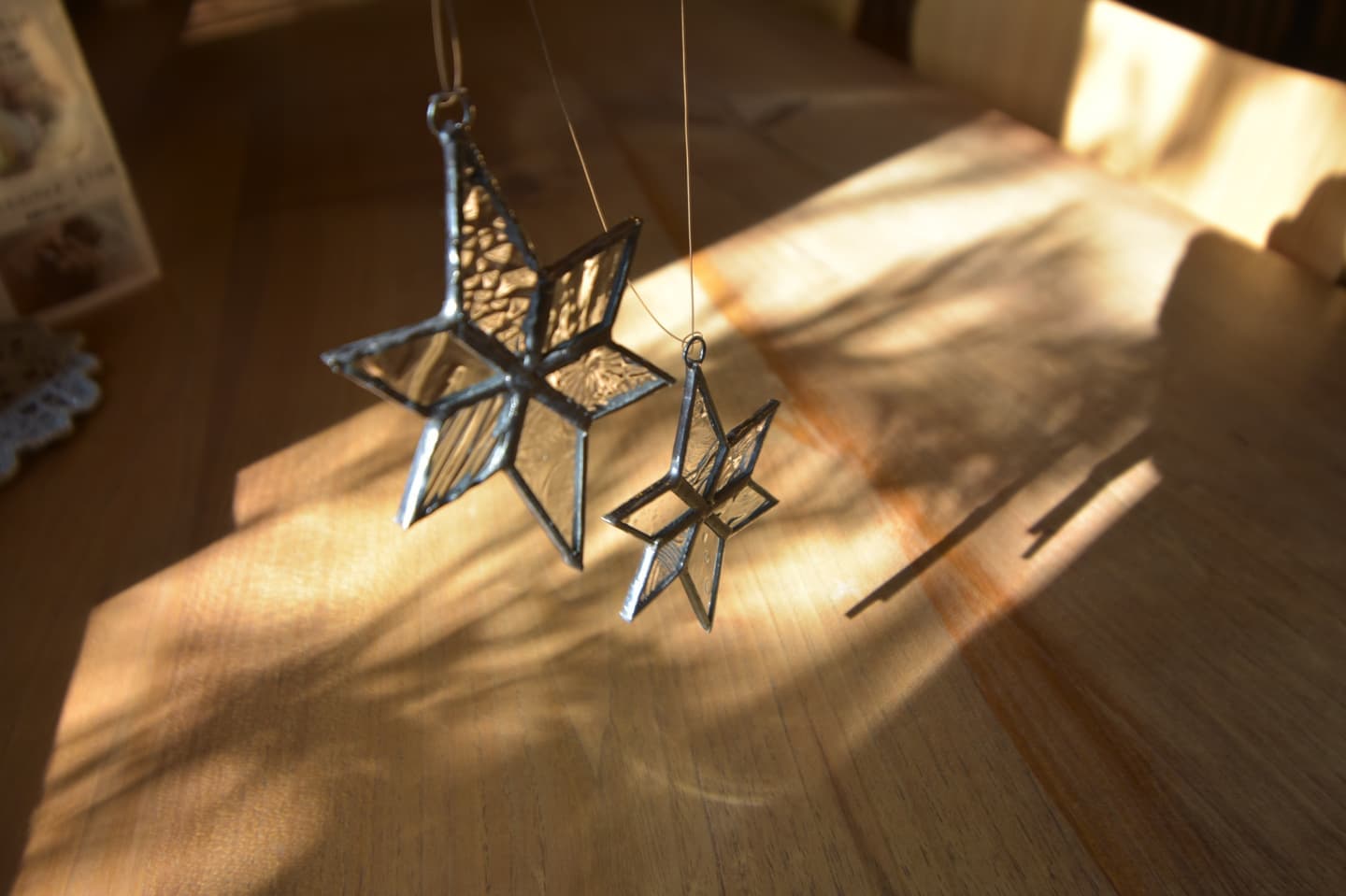 形作られたガラスにテープを周りに巻くところから始まり、はんだごてを使って作り上げていきます。