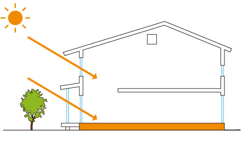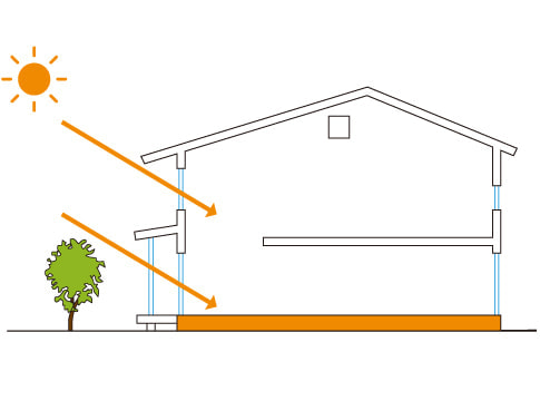 冬場はありがたい太陽の熱ですが、夏は困ります。窓から陽射しが入っていては、エアコンをつけたとしても効きが悪くて当然です。日射を遮蔽することは夏を快適にする基本です。また、太陽高度は方位によって異なることから、夏は東西面の窓からの日射を遮蔽することが大切になります。遮蔽する方法も、窓の外側で遮蔽するのが効果的です。