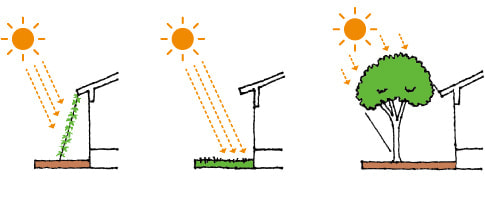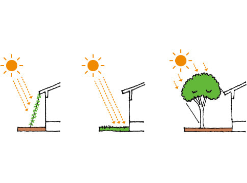 冬場はありがたい太陽の熱ですが、夏は困ります。前述したとおり、太陽熱エネルギーは強力で、夏に窓をそのままにしておくと電気ストーブをつけていることと同じになってしまいます。これではせっかくエアコンをつけたとしても効きが悪くて当然です。日射を遮蔽することは夏を快適にする基本です。また、太陽高度は方位によって異なることから、夏は東西面の窓からの日射を遮蔽することが大切になります。遮蔽する方法も、窓の外側で遮蔽するのが効果的です。