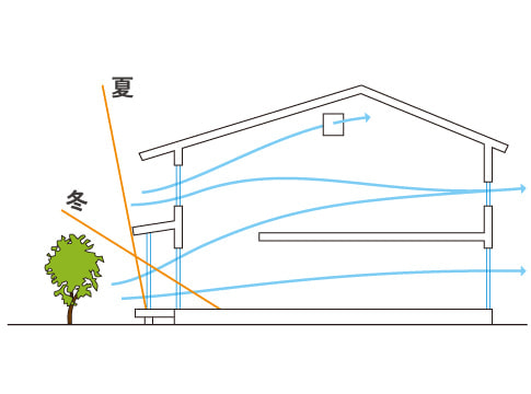 自然風利用は夏の夜間の過ごしやすさに寄与します。また、気流によって排熱を促進するという意味で夏の日中の過ごしやすさの面で効果が期待できます。風向に合わせて窓を設置したり、室内に風の通り道をつくったり、熱気を抜けやすくする高窓を設けたりなど、風や気流を活かす工夫があるのとないのでは、夏の過ごしやすさに差が生じます。もちろん、猛暑続きの近年は窓を開けられないケースも多々ありますので、取り入れるべき風であることが自然風利用の前提となります。