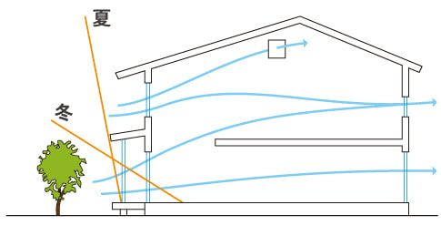 風向に合わせて窓を設置したり、室内に風の通り道をつくったり、熱気を抜けやすくする高窓を設けたりなど、風や気流を活かす工夫があるのとないのでは、夏の過ごしやすさに差が生じます。もちろん、猛暑続きの近年は窓を開けられないケースも多々ありますので、取り入れるべき風であることが自然風利用の前提となります。