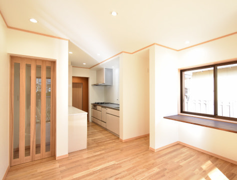 ダイニングキッチンだった居室をキッチンのみに変更し、壁を新設することにより廊下側で使用できる物入れと洗面台を新設しました。茶の間と仕切られていた建具は撤去し、ダイニングと繋がる空間としました。