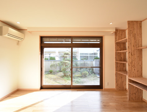 造作の飾り棚を撤去し、広々とした空間に改修しました。飾り棚を無くしたことで、居室の出入口も広く使えるようになりました。窓は既設サッシのガラスを単層から複層に変更することで断熱性を良くしました。