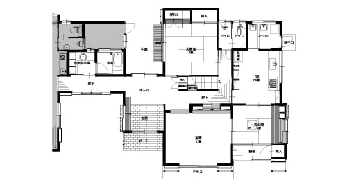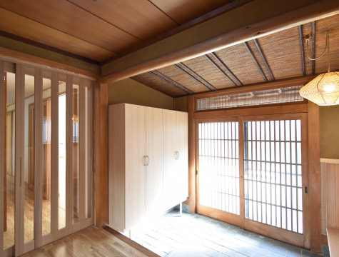 畳敷きだった茶の間から板張りの居室に改修し、縁側のあった襖を撤去することで一体空間として広々使えるようにしました。リビングに続く建具は引違戸から引込戸にすることで、よりリビングとダイニングの空間が繋がるようにしました。