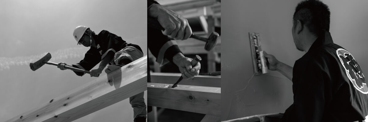 施工精度を上げるには、工程管理と品質管理が欠かせません。次の仕事がやりやすいように引き継ぐというだけでなく、ゴミやエネルギー、時間などの無駄をなくすことも大切です。単にマニュアルどおりにつくるのではなく、いいものをつくりたい、住まい手に喜んでもらいたい、という気持ちが施工精度を上げ、完成したものに表れます。木の家は機械がつくるのではない、人が真心を込めてつくるからこそ温かい。職人の手の温もりの奥には、いつも真心が控えています。