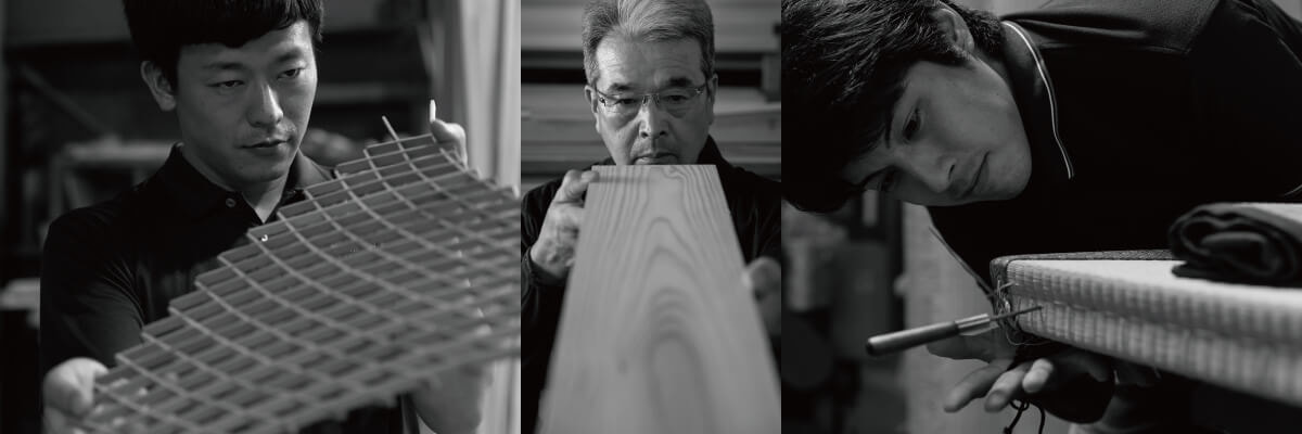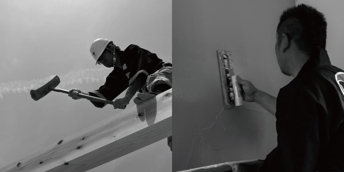 家づくりの現場にはさまざまな職人が関わります。ナルセノイエの現場では、自分の工程だけでなく、前後の工程や同時進行している他の職人の仕事が、いかにやりやすくなるかを考えて仕事に臨んでいます。お互いを気遣い、気持ちよく仕事を進めることができる―。それが「チームでつくる」という言葉に表れています。