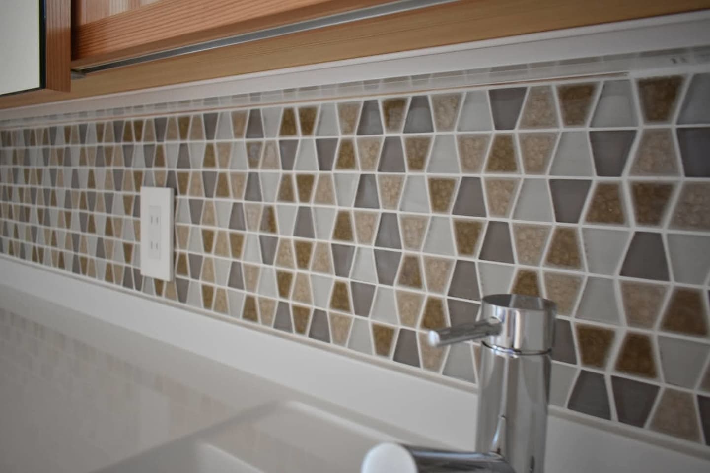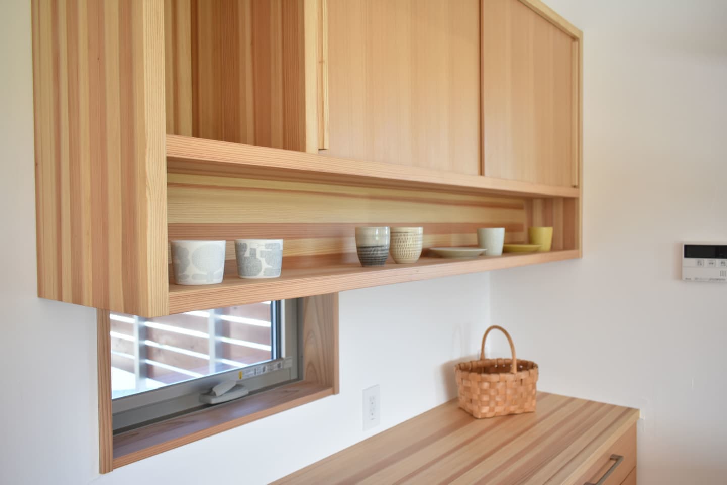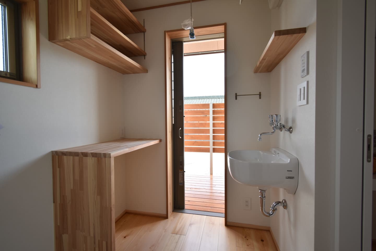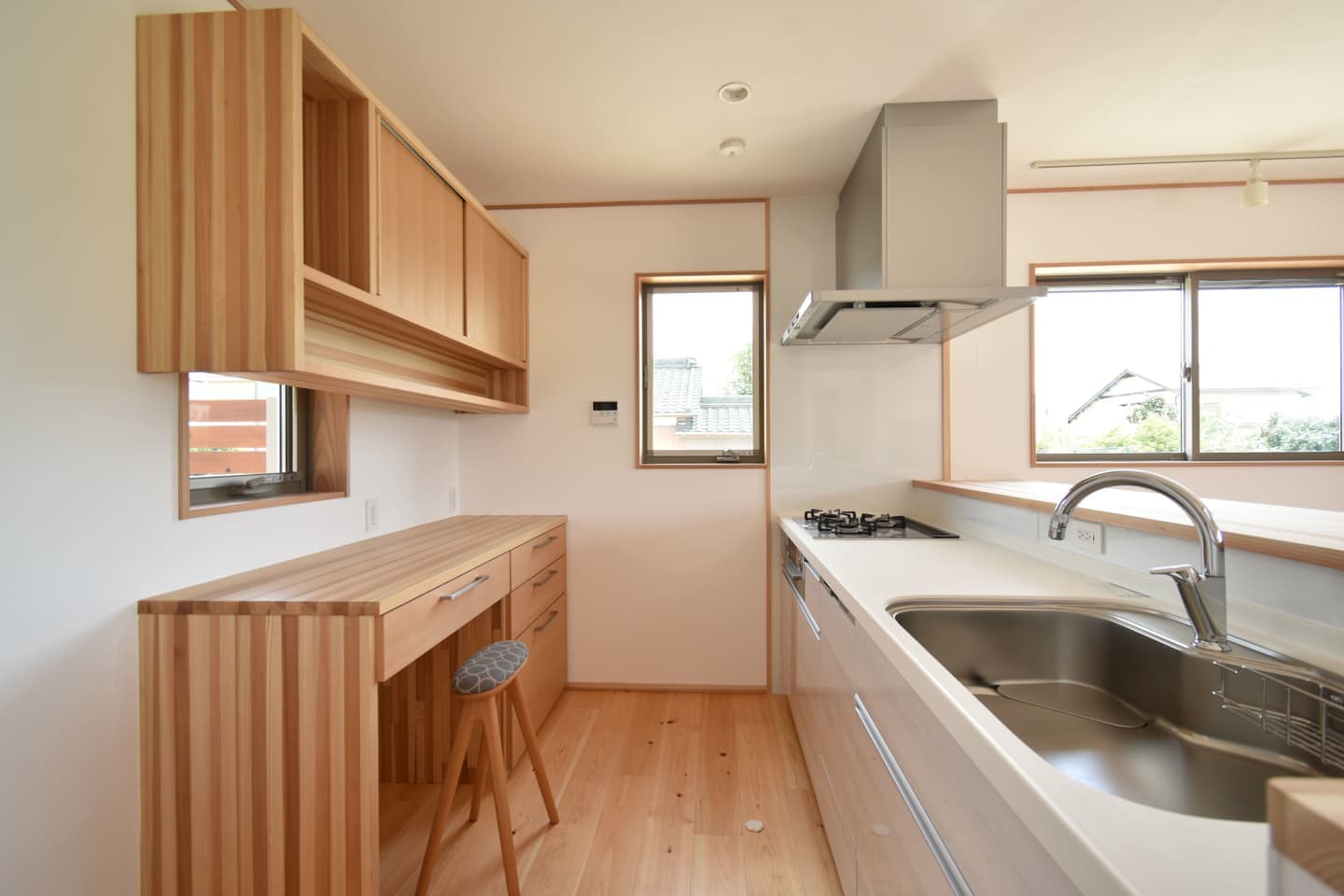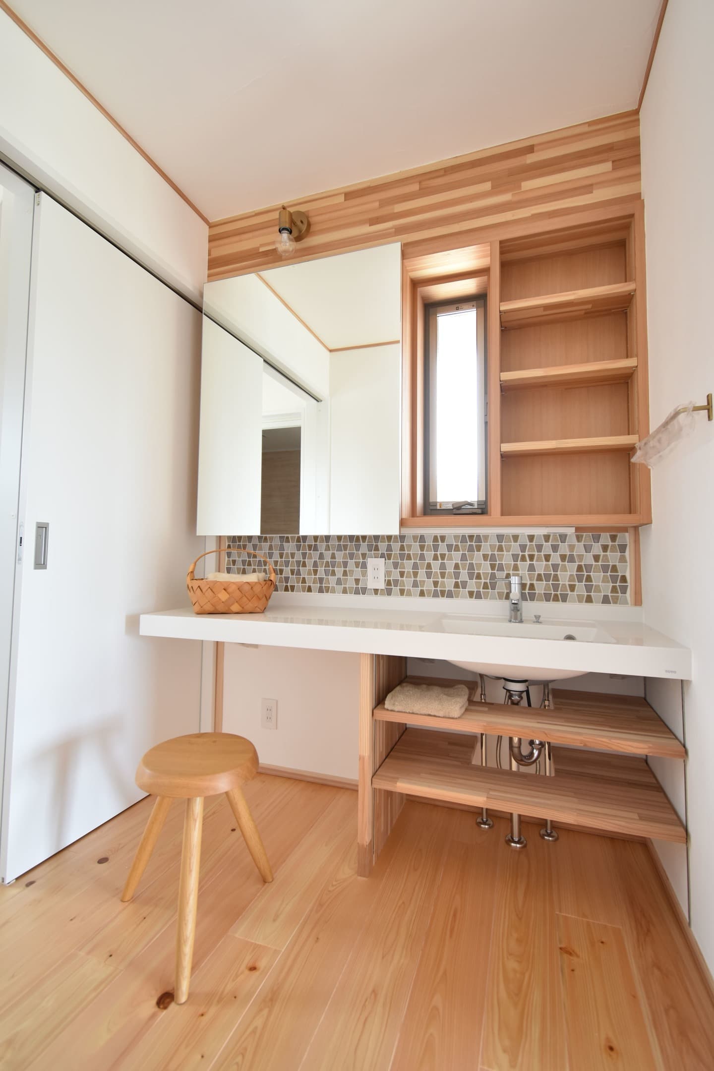 造作のカップボードやパウダーコーナー、大きな窓と吹抜けのバランス、外の自然を感じる眺め、洗濯と収納の生活動線にもこだわりました。