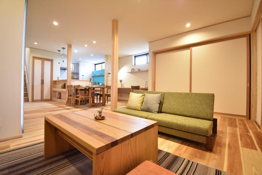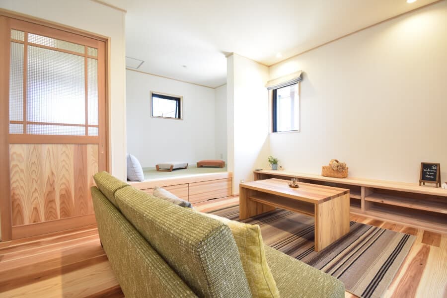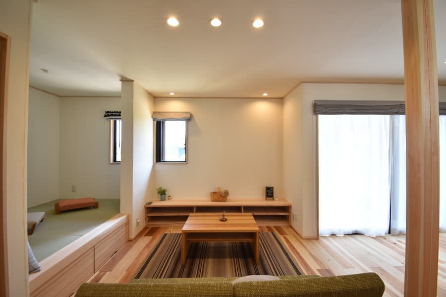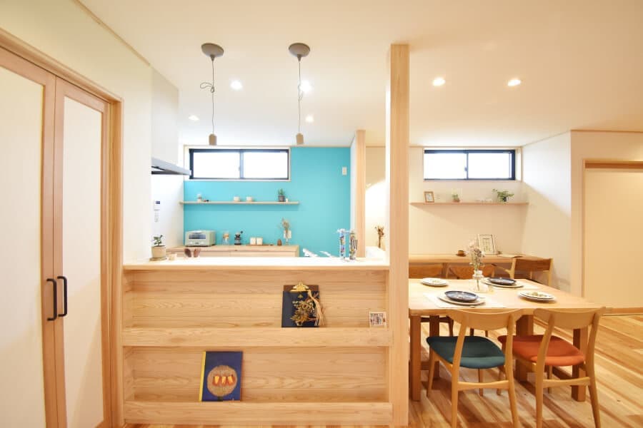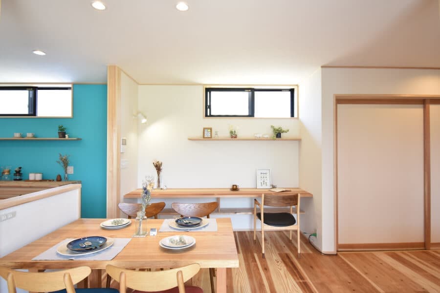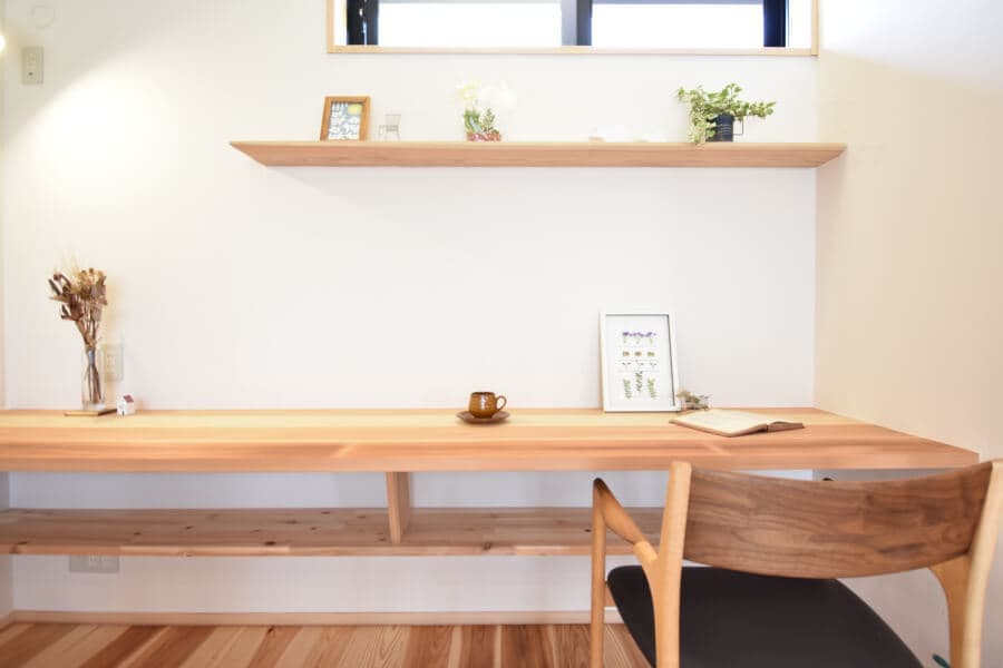 この家は心地よさが溢れる暮らしを叶えます。ワークスペースは家族が自由に使えるオープンタイプで、家族が集まりながら自分の時間を楽しめます。食を暮らしの中心に考えることで、家族の絆が深まり、小上がりのタタミスペースはくつろぎの場所としても使え、ゆったりとした時間を過ごせます。帰宅時にすぐ手洗い、うがいができる洗面所は便利でお客様も気を遣わずに過ごせます。お気に入りの雑貨に囲まれると気分が高揚し、生活もはかどることでしょう。外とのつながりも大切にし、開放的な空間が圧迫感のない居心地の良い雰囲気を演出。シンプルな動線で自然素材と白の空間が調和し、心穏やかな暮らしをサポートします。この家では、家族の絆やくつろぎの時間を大切にしながら、自然と共に心豊かな暮らしが楽しめることでしょう。
