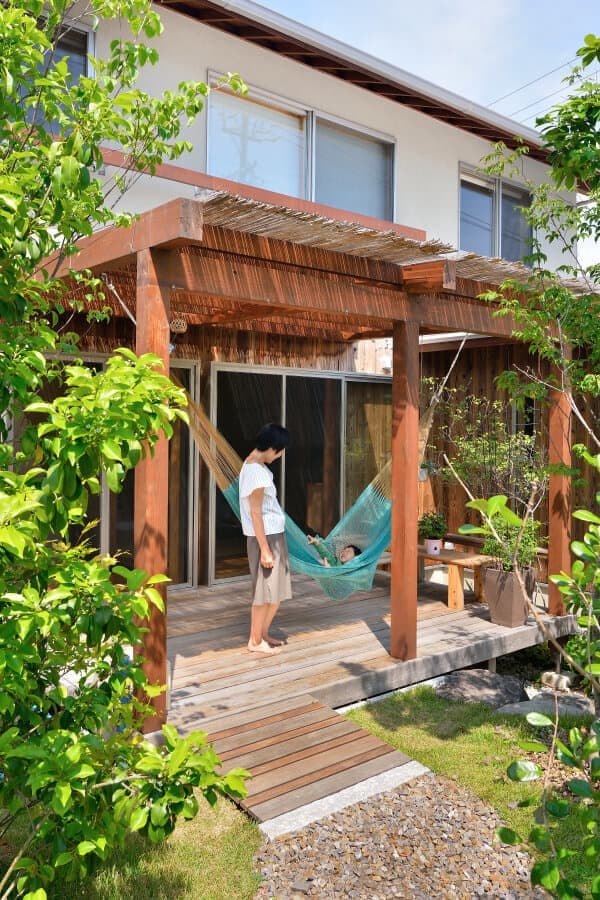 木と畳、薪ストーブとハンモックが一堂に会し、しかも見事に調和。