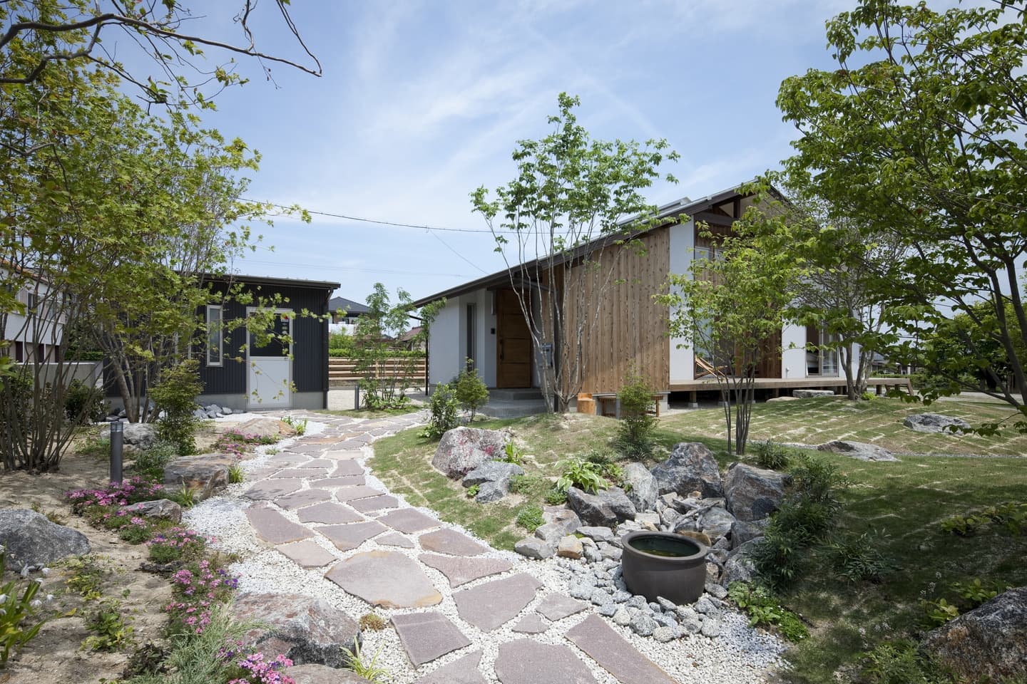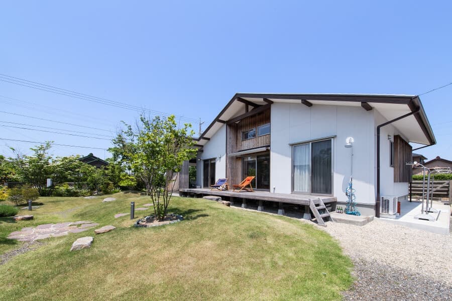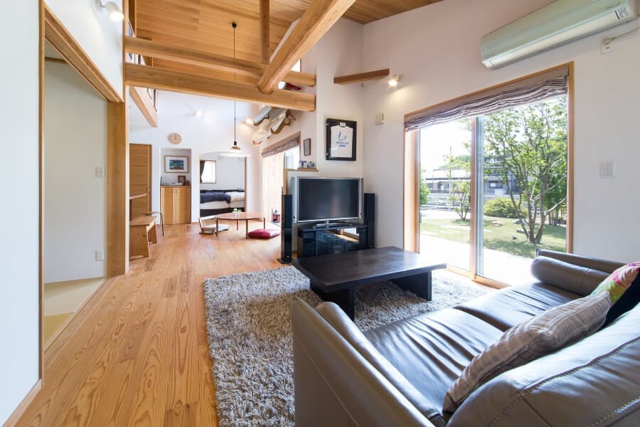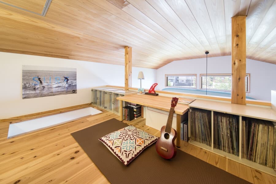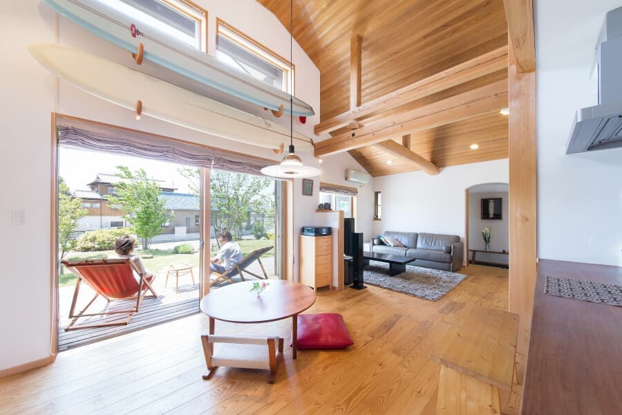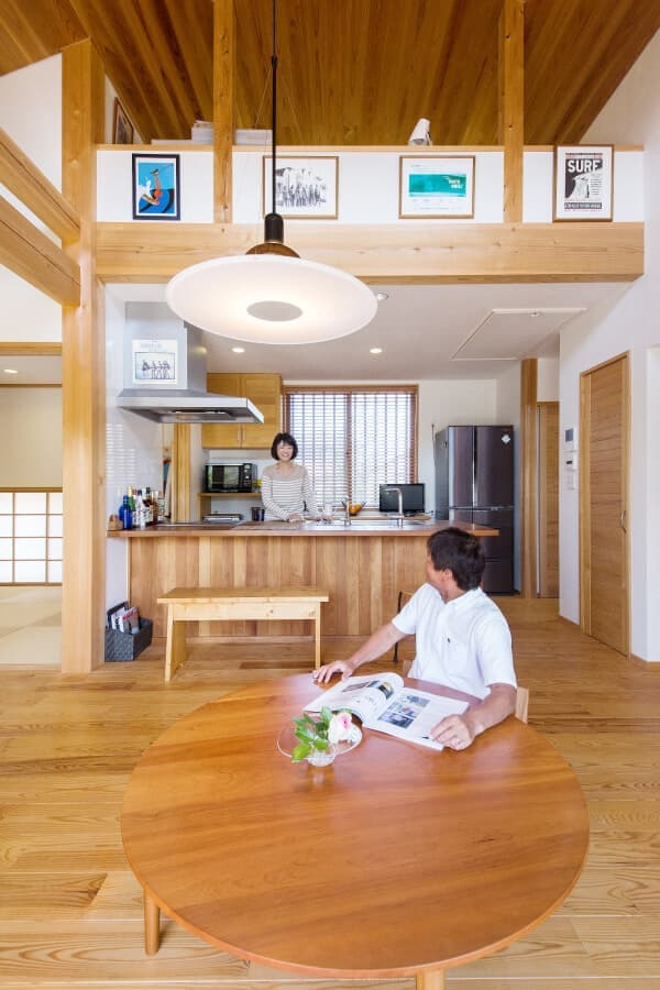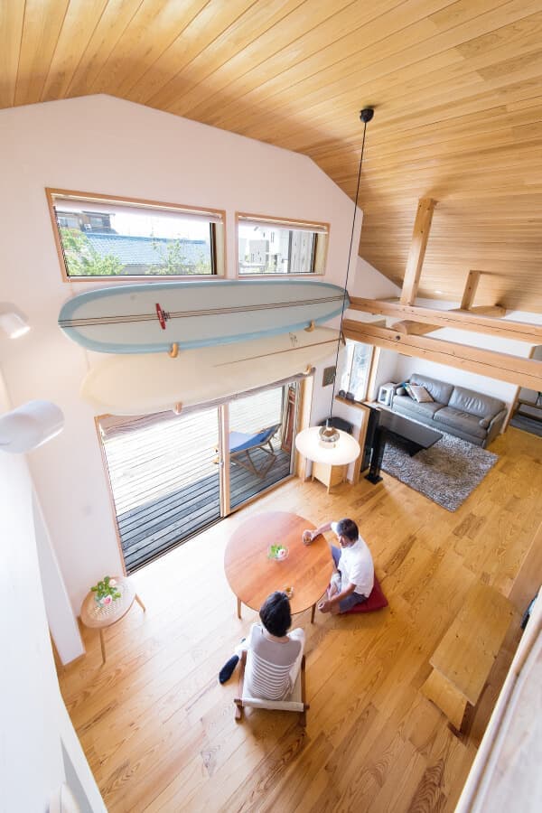 ダイニングキッチンを中心にリビングや水廻り、寝室、和室が配された間取りは、廊下などの無駄なスペースがなく、すべてが緩やかにつながっており、動線もシンプルとなっています。ダイニングには高さ4.5mもの開放感たっぷりの空間がありそこにご主人お気に入りのサーフボードが飾られています。人生100年と言われるこの時代、50歳代のご夫婦が趣味を楽しみながらこれからの人生を豊かに、穏やかに暮らす、理想の住まいとなっております。