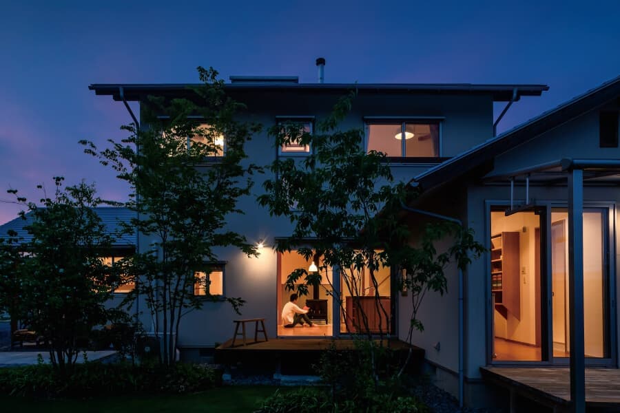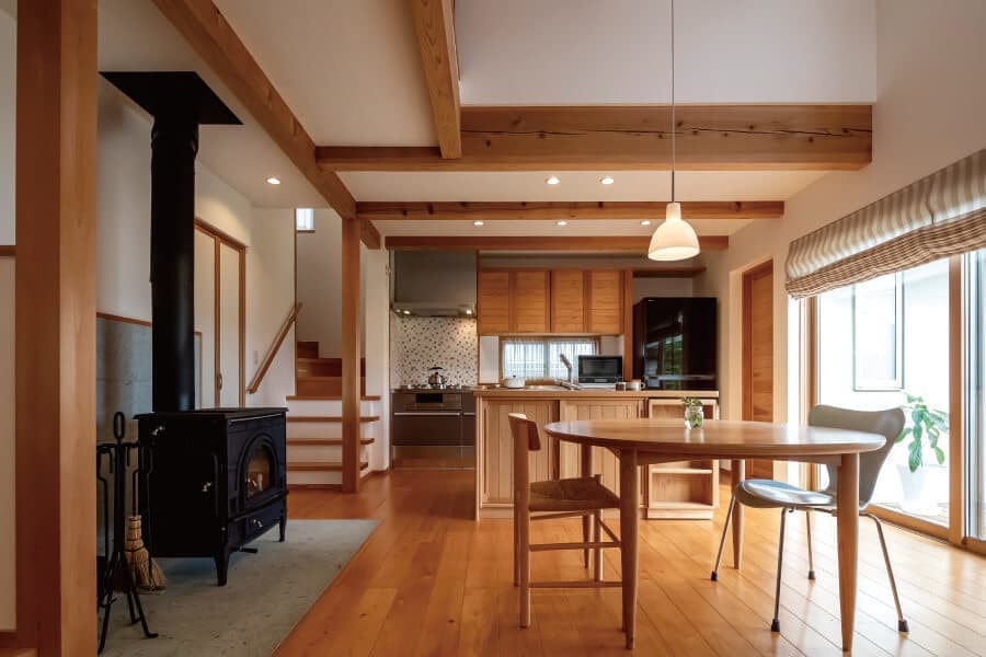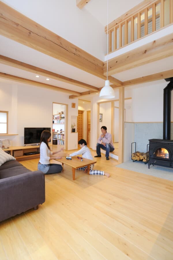 こだわったのは「安心して暮らせる」家づくり。住まい手さんのご要望に応え、天然素材をふんだんに使用したパッシブデザインを実現しました。暖かな暖炉の周りで、家族が笑顔で団欒する。パチパチと薪の燃える音が心地よく、揺れる炎は見る者の心を落ち着ける―。映画のように素敵な日常。