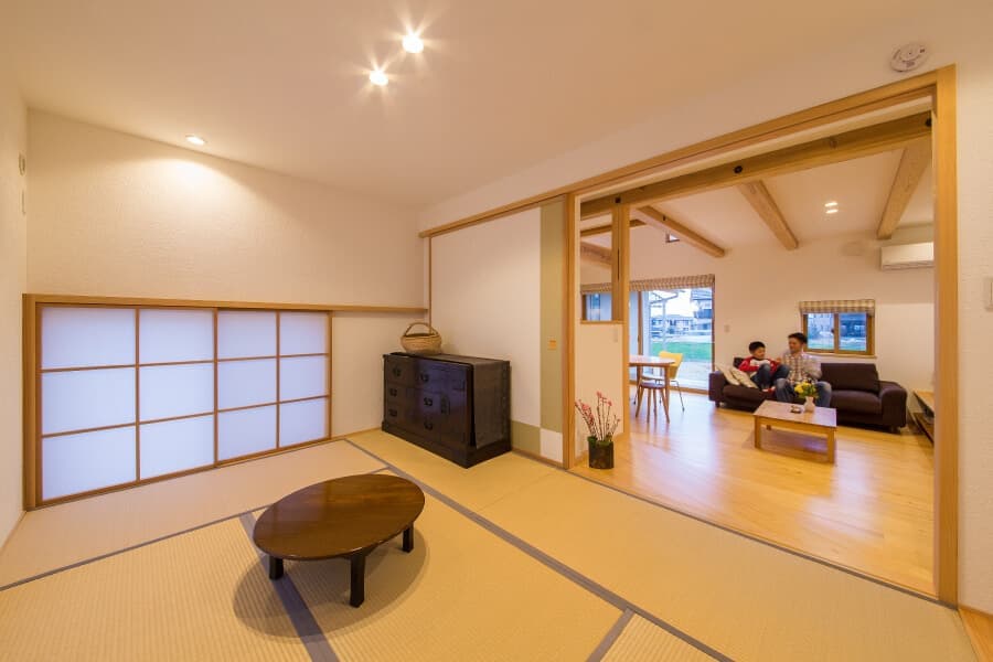 和室はあえて1段高くし、ソファに座る家族と目線の高さが合うように。