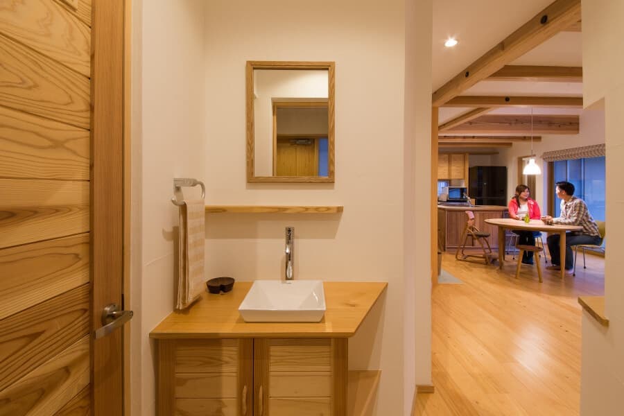 外から帰ってきて手洗い、うがいできる空間。木と陶器を使った造作洗面台。