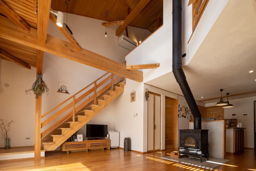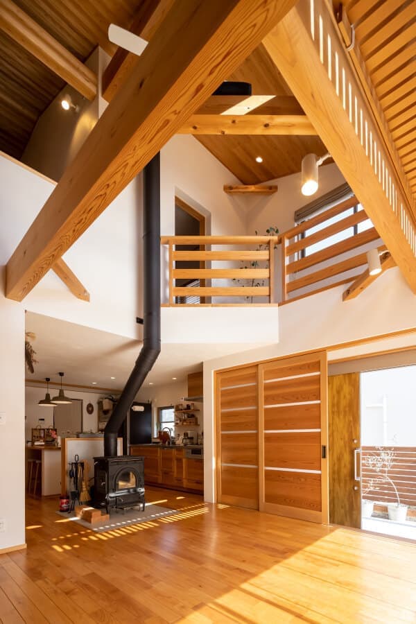 家の中心に置かれた薪ストーブ。吹き抜けのある南の大開口からは陽射しが降り注ぎ、開放感あふれる暖かな住まい。
