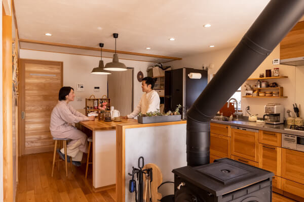 キッチンの向かいに置かれたカウンターは作業台としても重宝する。このカウンター(作業台)と薪ストーブの配置がプランを決める要となった。