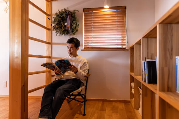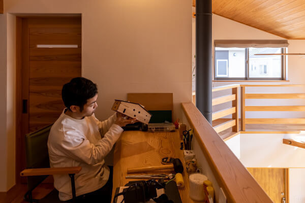「それまでは主人の作業スペースとして重宝しそうです。冬場は吹き抜けを介して太陽の陽射しが室内に燦々と降り注ぐので、主人は思ったよりも薪ストーブの出番が少ないのが寂しいと思っているかもしれません。でもその分、火を入れたときの時間がとてもワクワクして楽しいんだと思います。」
