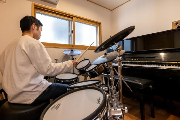 開放的なLDKとは対照的に、適度に囲まれ感のある階段上の踊り場スペース。壁の飾りやスイッチボックスは奥さまのこだわりが表れている。3畳の音楽室ではドラムやピアノの演奏に没頭できる。