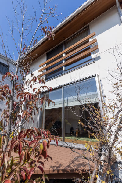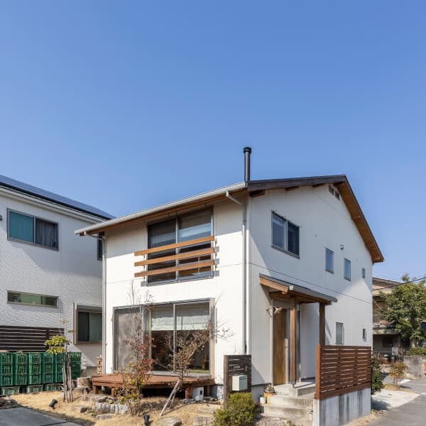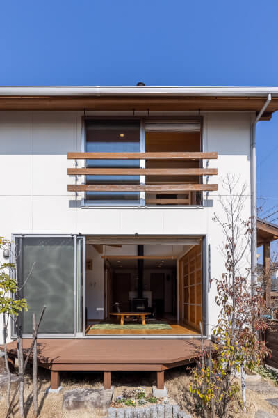 煙突が見えるシンプルな切妻屋根、白い外壁と木の手摺や塀、デッキがナチュラルな雰囲気を感じさせる外観。