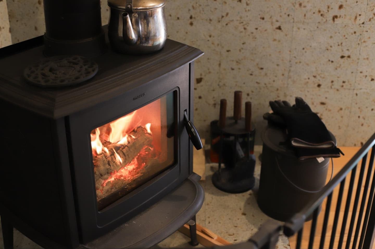 薪ストーブ仕事は基本的にご主人のお仕事。近隣で大きな庭木の剪定があった時など、ご近所の方や庭師の方から連絡をもらい、引き取った枝木を薪にし、お庭の薪棚で自然乾燥しながら保管。お休みの日に、朝早く起きて火を焚べ、珈琲と新聞を読むひとり時間がご主人の楽しみ。