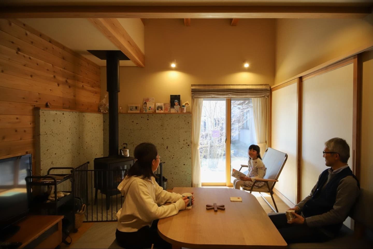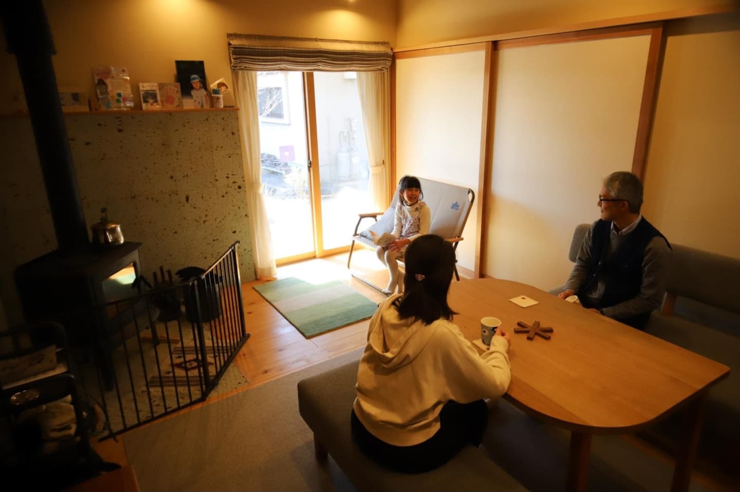 ご夫婦と9歳の娘さんの3人家族。薪ストーブのあるリビングが家族の暮らしの中心にある。娘さんが座るチェアの後ろの引き戸を開けると和室につながり、そこが娘さんのお部屋になっている。
