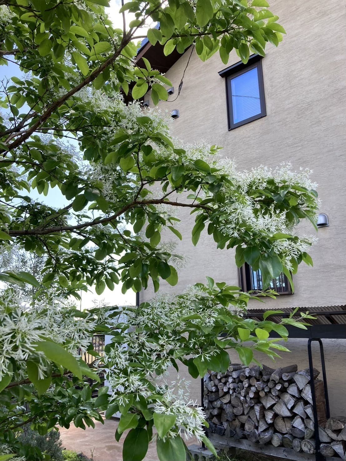 ナンジャモンジャの木(ヒトツバタゴ)を中心として、石をサークル状に敷き詰め、グランドカバーで覆った西側のお庭。