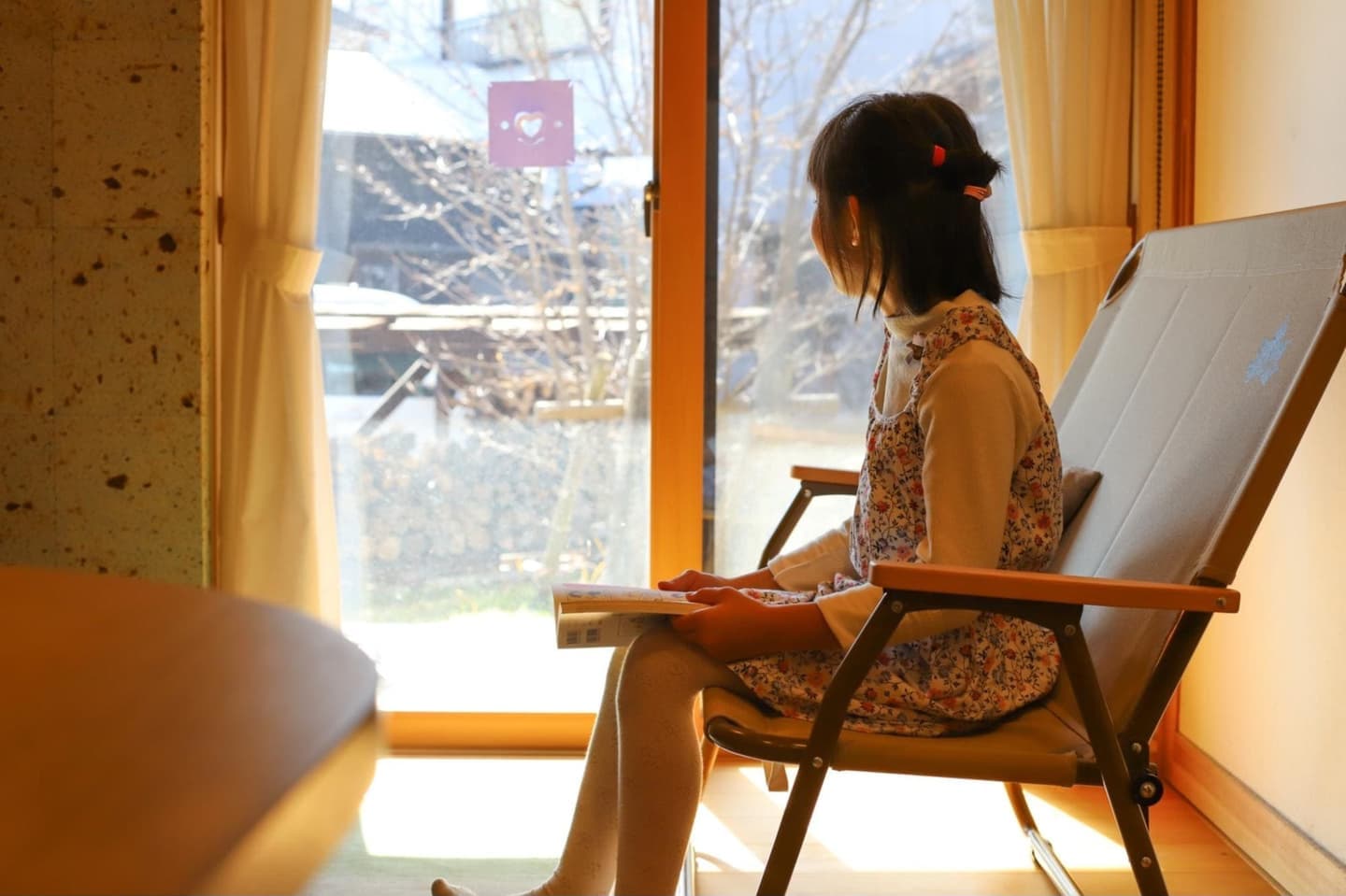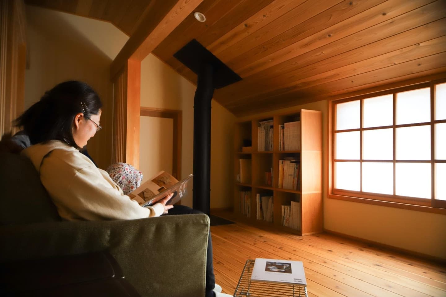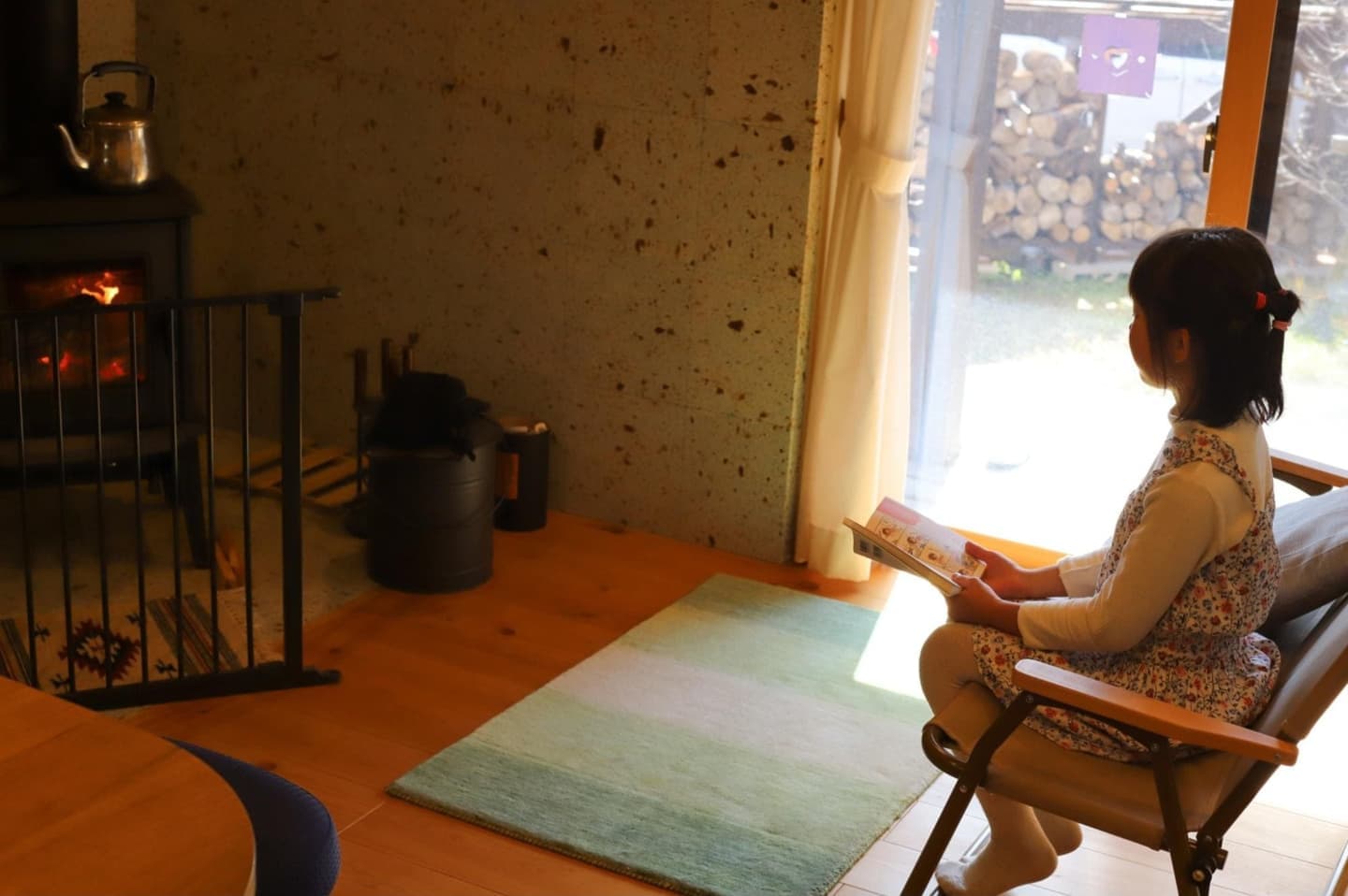 お庭と薪ストーブを眺める特等席で、本を読むのが楽しいという娘さん。
