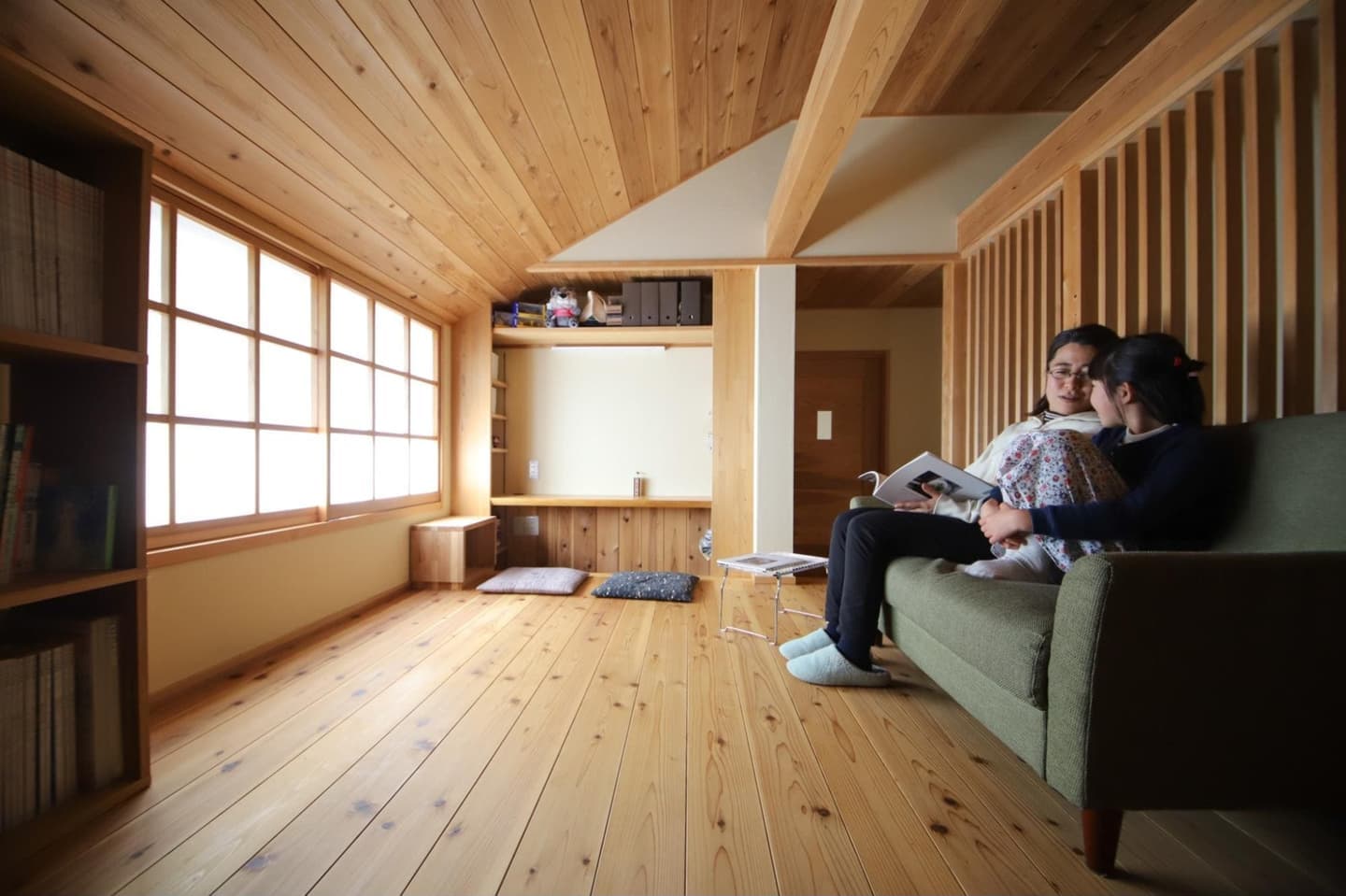 2Fの一角にあるこのスペースは、勾配天井と床を小上がりにしているおかげで屋根裏部屋のような雰囲気。障子で光が柔らかくなり、ホッと落ち着くお籠り空間。